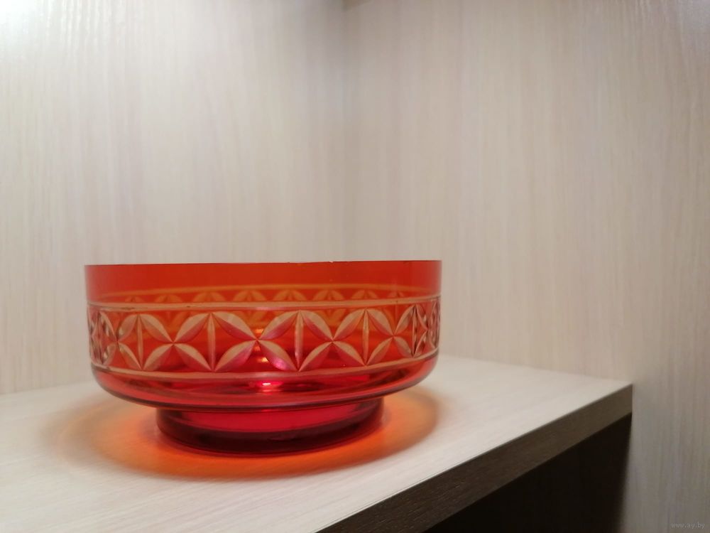 3 изделия из красного хрусталя: ваза/салатник и два стакана производства 70-х годов времен СССР. Хорошее дополнение к домашней коллекции красного стекла.