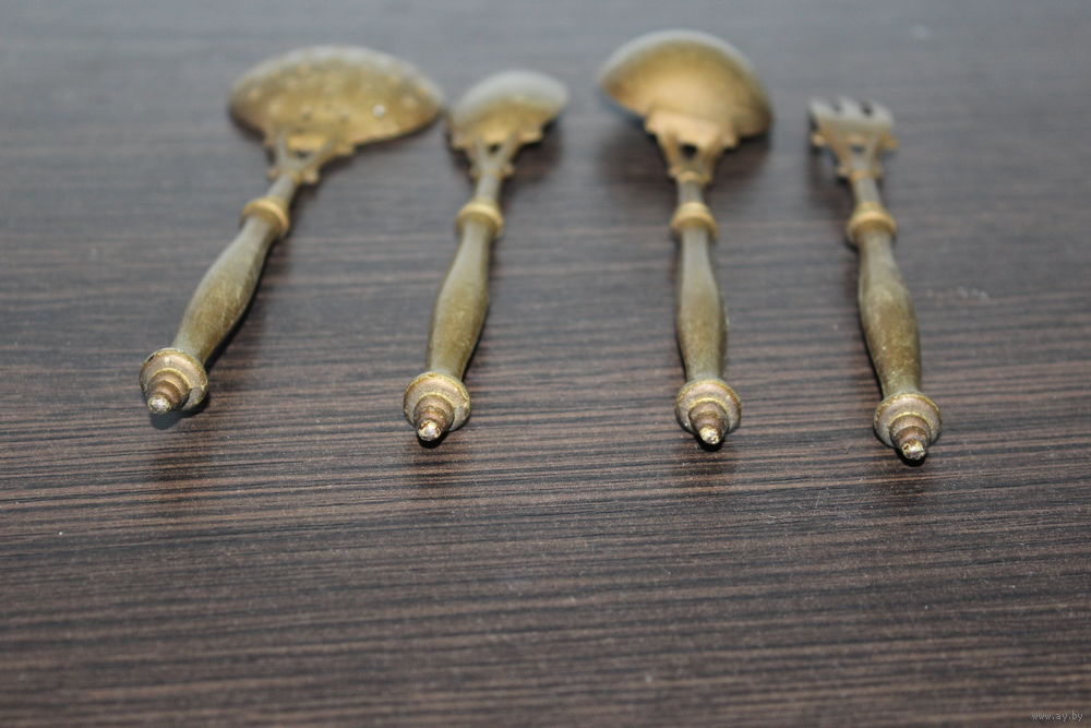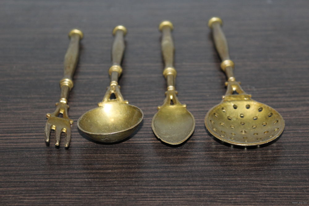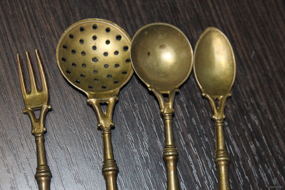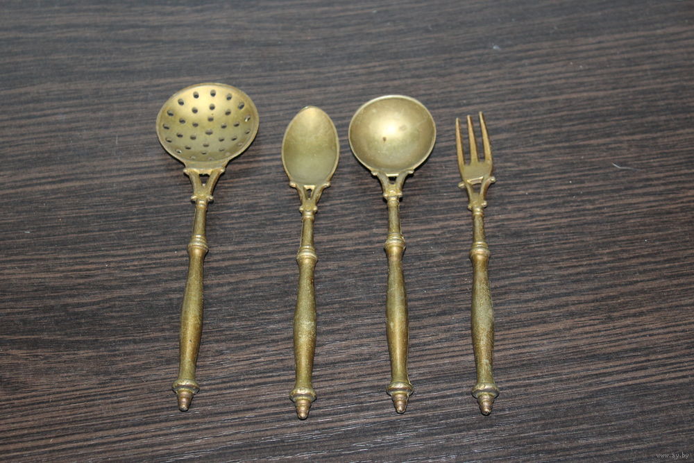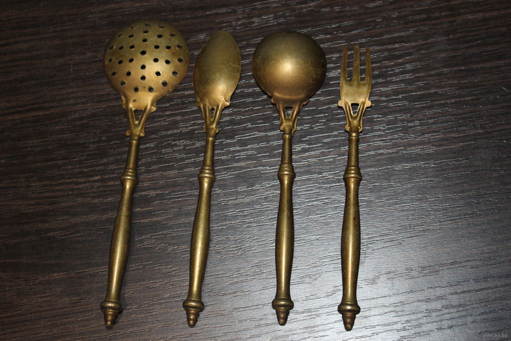 | Присутствуют царапинки, потертости, длина овальной ложки 16,4 см., круглой ложки 16 см., ложки с дырочками 17,4 см., вилки 15,5 см. | |