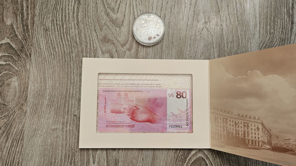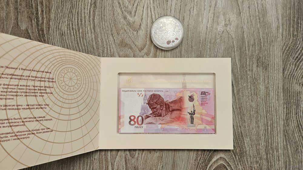 Набор Монета 20 рублей серебро + Купюра 80 рублей 80 лет Победы 2025.