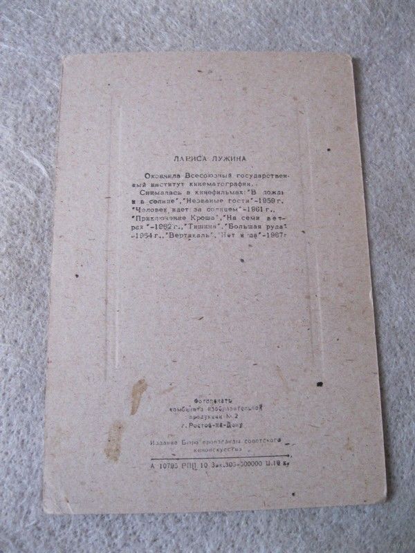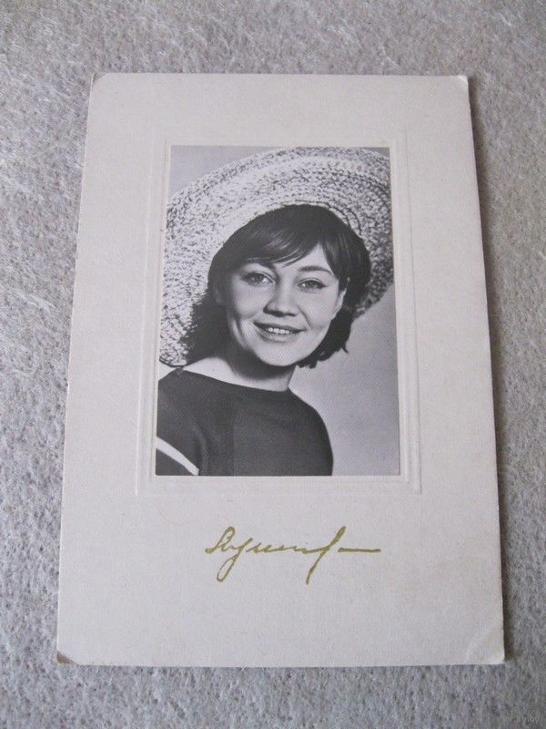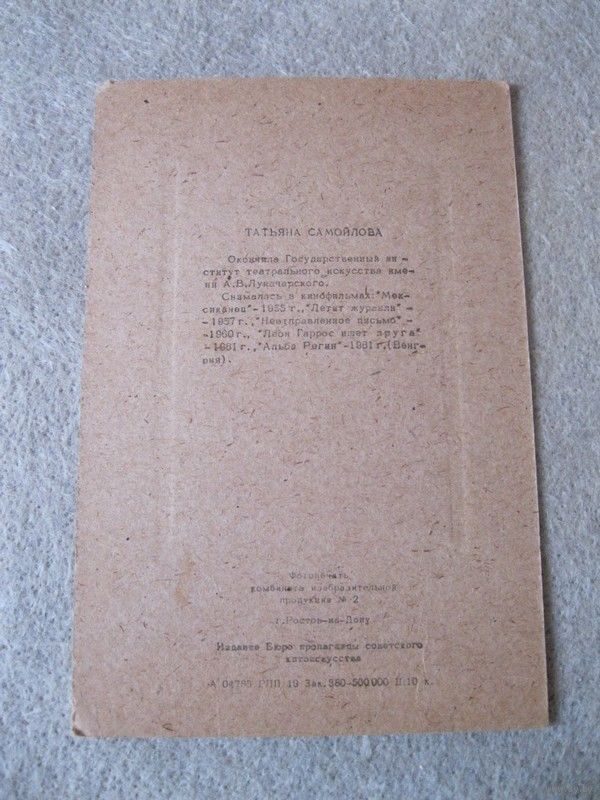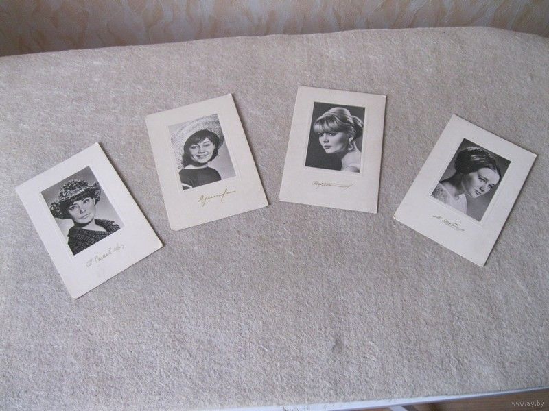 4 черно-белых открытки(фотографии в паспарту с факсимильной подписью актрис). Размеры открыток: 100 мм х 150 мм . Издание Бюро пропаганды советского киноискусства. Фотопечать комбината изобразительной продукции N2, г. Ростов-на-Дону.