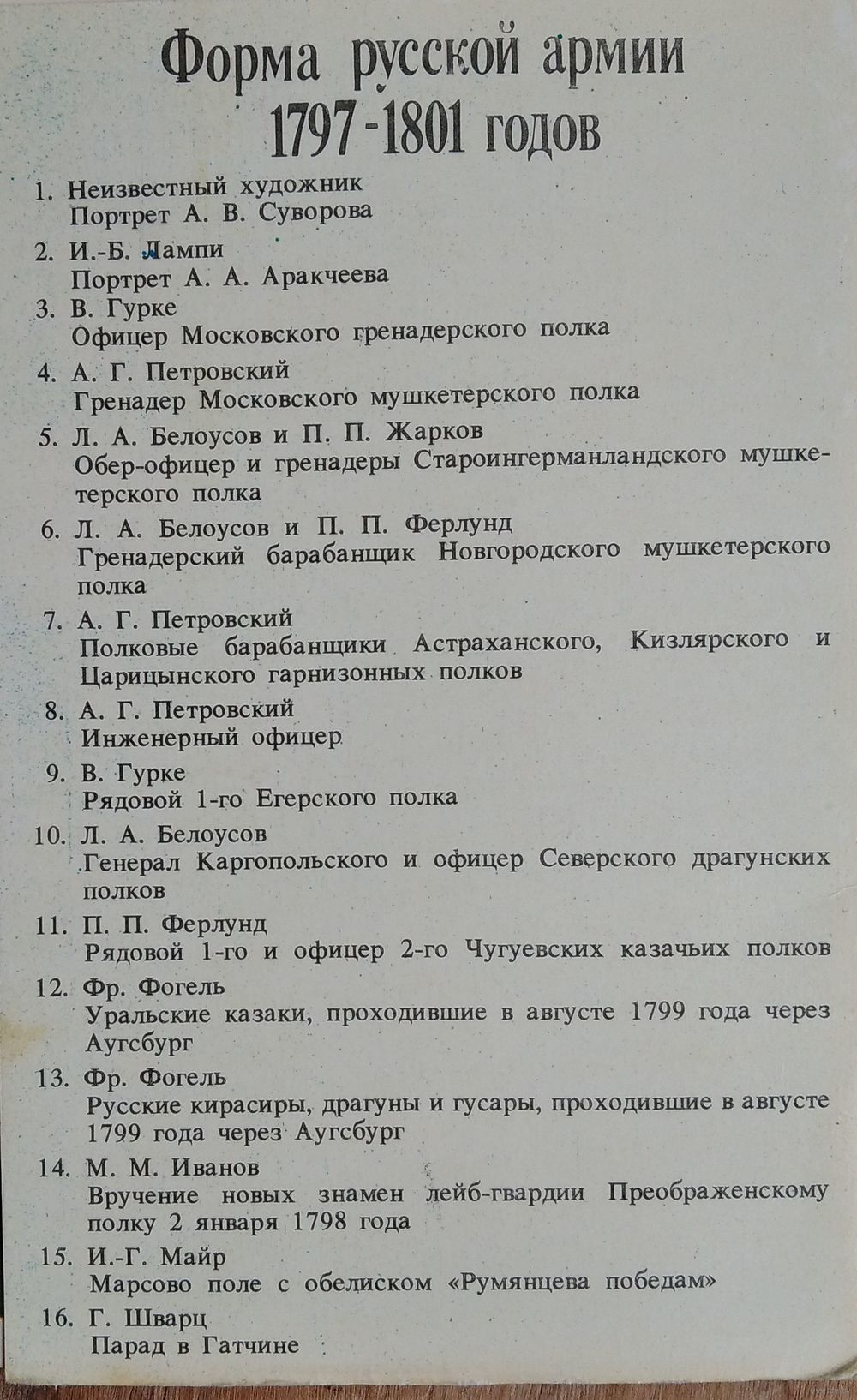 Набор открыток "Форма русской армии 1797 - 1801 годов". 1991 г. 16 откр.