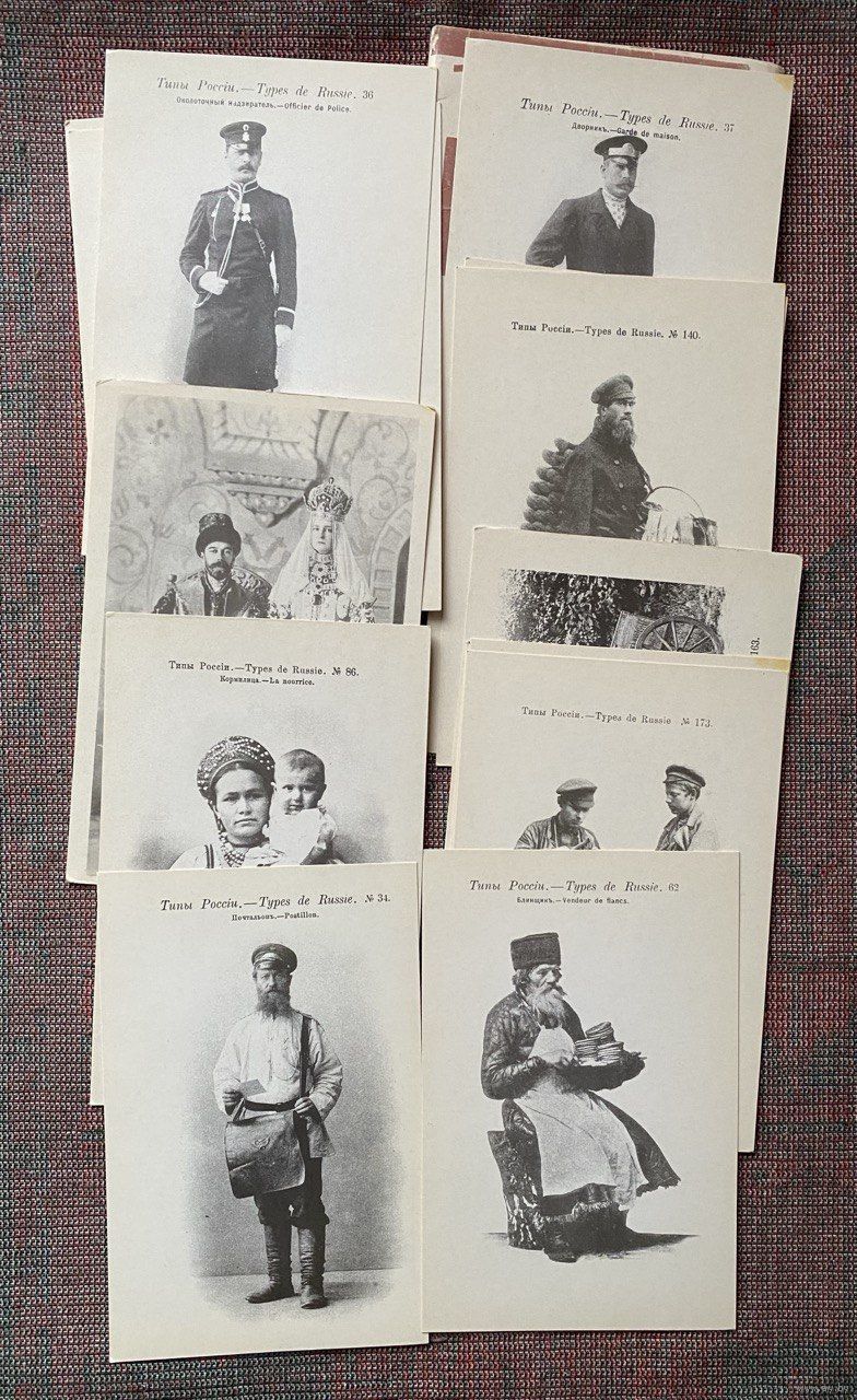 В комплекте 16 открыток ( в наличии 15): Продавец арбузов; Блинщик; Дворник; Кормилица с ребенком; Холодные сапожники; Тройка; Сборщик пожертвований; Продавец кондитерского мороженого; Типы России; Продавец груш; Околоточный надзиратель; Типы России; Почтальон; Типы России; Николай II с супругой в день коронации; Открытка Николай II с семьей - отсутствует..