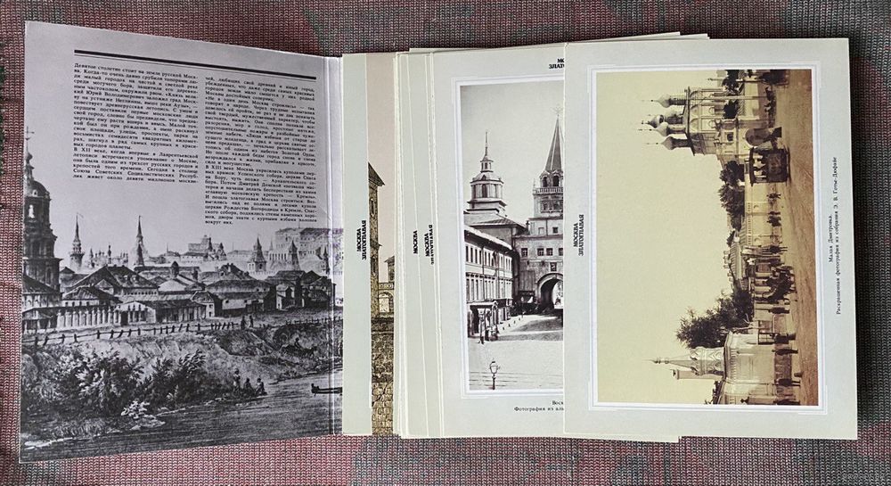 «Москва златоглавая» - первый выпуск листовок о старой Москве. В комплект вошли литографии, гравюры, фотографии из фондов Государственной библиотеки СССР имени В.И. Ленина, Государственной центральной театральной библиотеки, а также из частного собрания московского коллекционера П.С. Романова. На оборотных сторонах листовок размещены эссе по истории города.