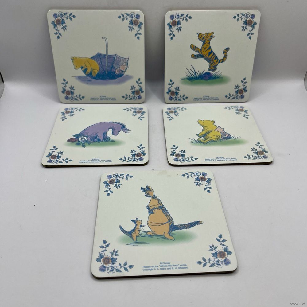 Сувенирный винтажный набор подставок под чашки от компании Disney c изображением героев мультфильма Винни Пух. 5 шт., в наборе не хватает одной подставки. Изображения на подставках не повторяются. С незначительными следами бытования. Размер 10 х 10 см. В оригинальной коробке.