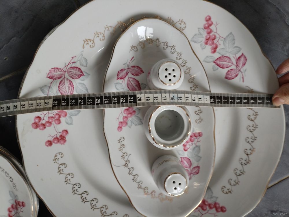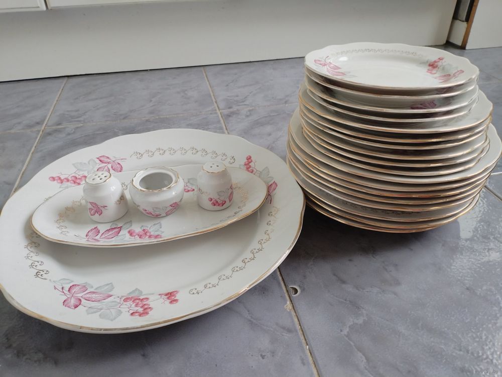 Набор посуды б/у 23 предмета без дефектов Рижский фарфоровый завод. Блюдо большое R 35 см, 3 тарелки 24 см, 5 глубоких 24 см, 6 тарелок 20 см, 4 тарелки 18 см, 1 овальная 28х15. Набор сольница, перечница, горчичница. По Минску есть возможность доставить.