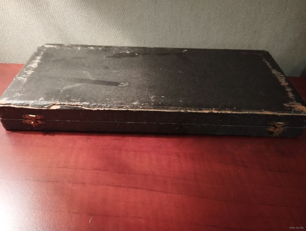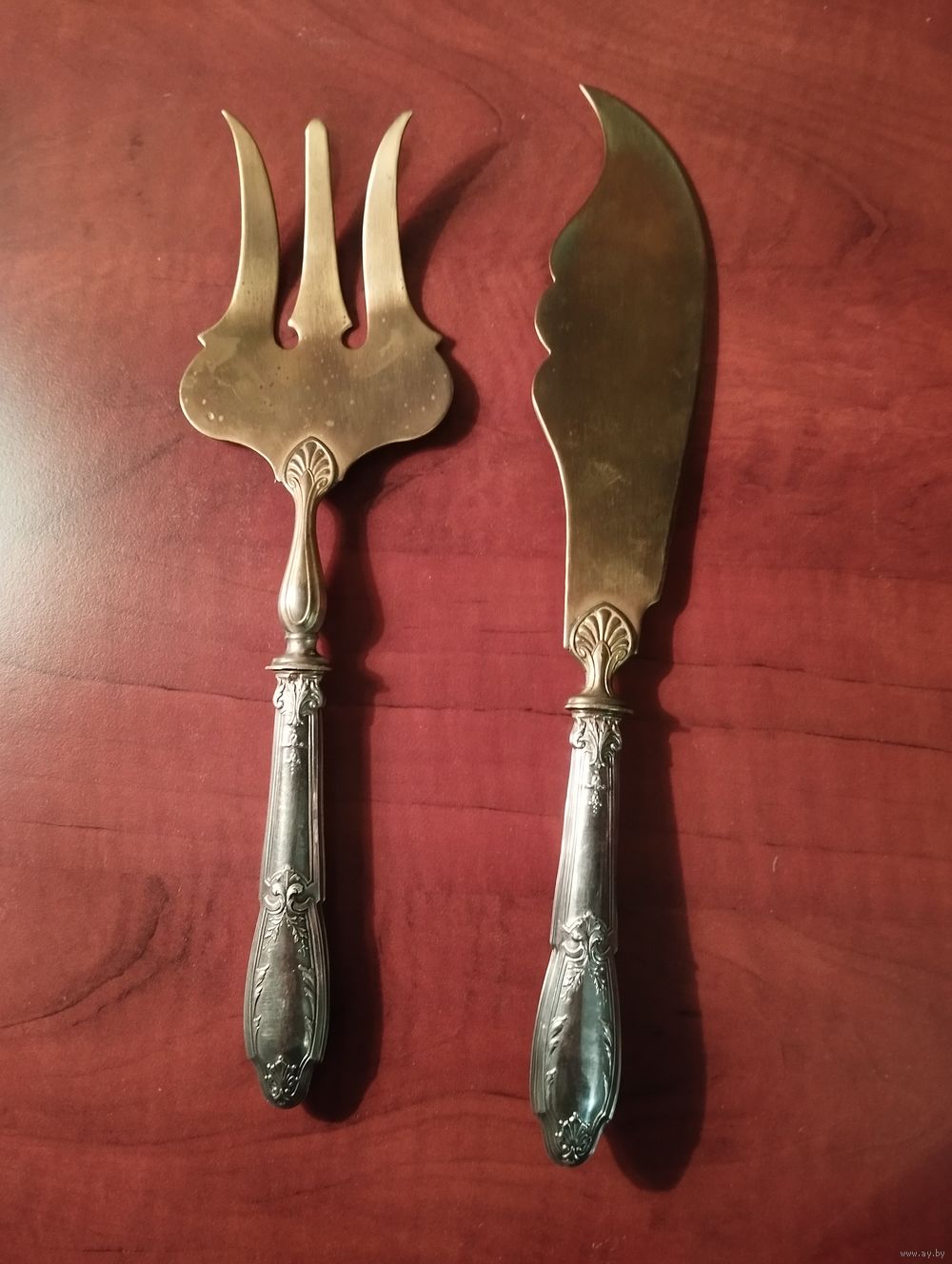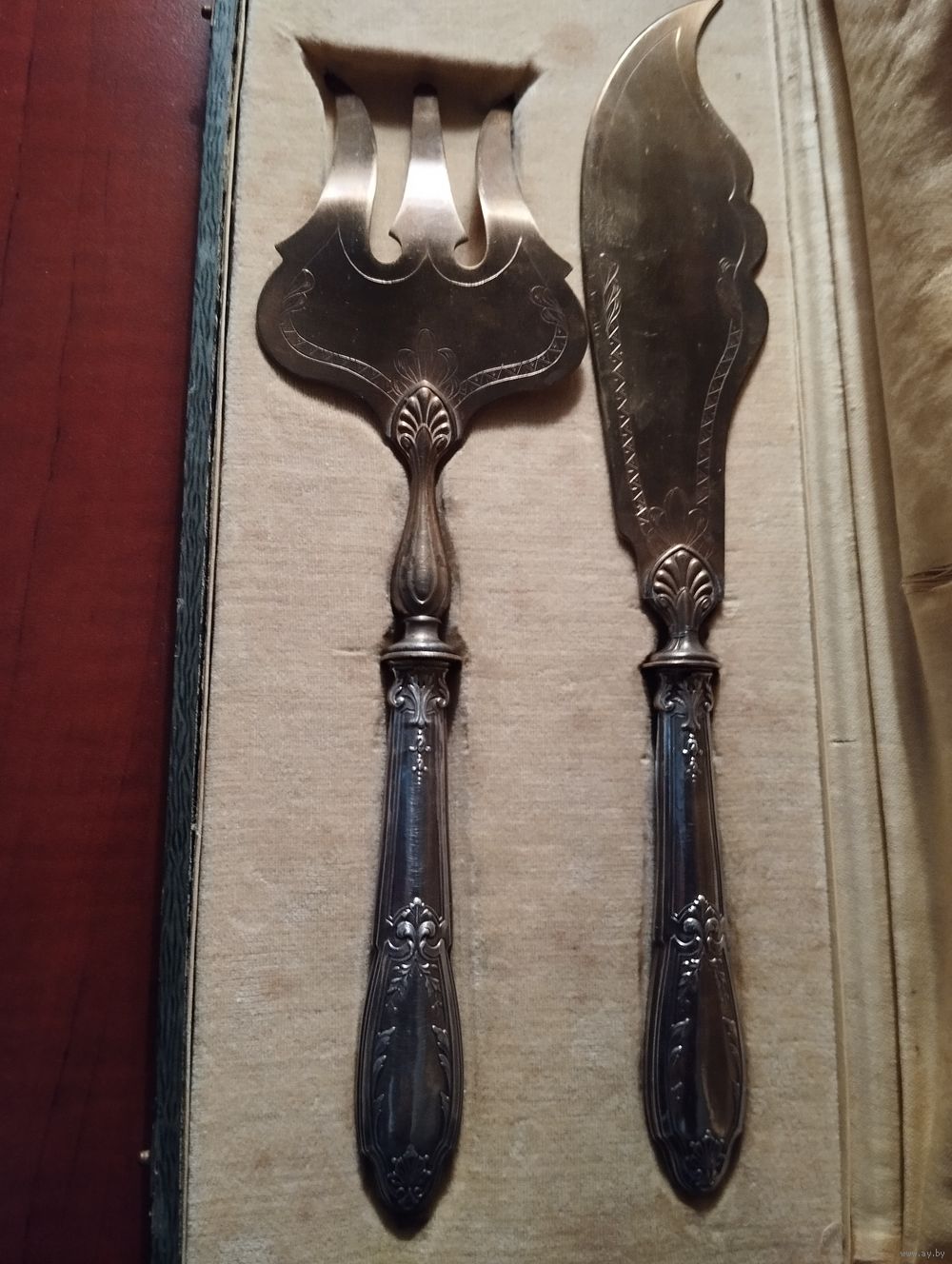 Проба 830-я. Ручка серебро, рабочая часть бронза с позолотой. Старая красивая работа в оригинальном футляре. Большой размер, нож 30 см. вилка 26 см., очень красивое изделие.