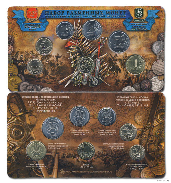 1026/2146 Набор разменных монет Банка России 2012 ММД 10, 5, 2, 1 рублей, 50, 10 копеек (6 шт.) + жетон (латунь). В буклете