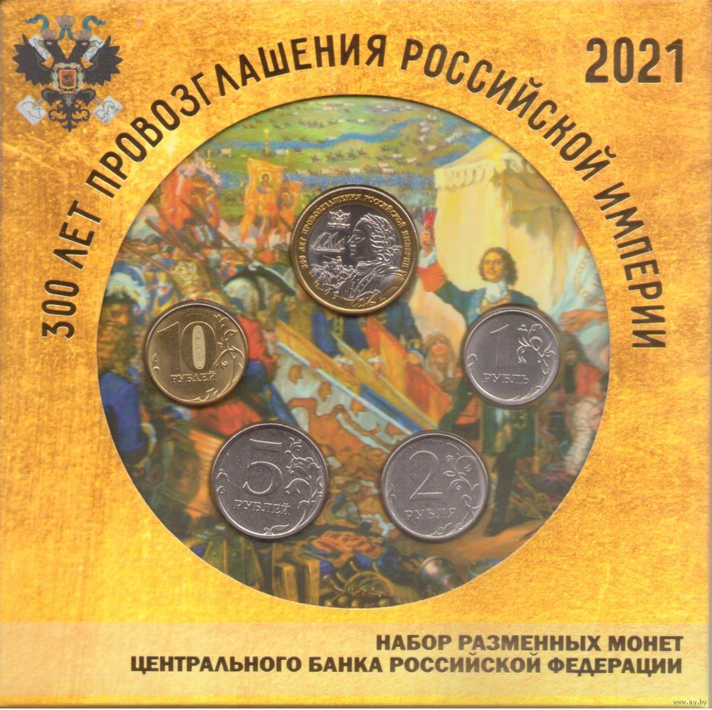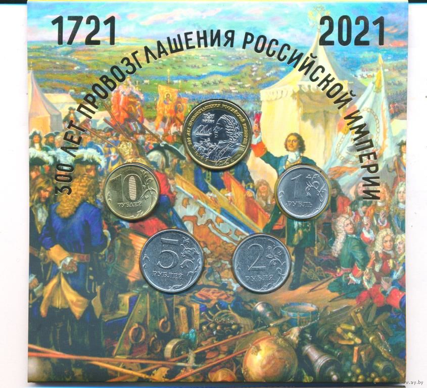 Набор разменных монет Банка России 2021 ММД 10, 5, 2, 1 рублей (4 шт.)+ Жетон Гознак. 300 лет Провозглашения Российской империи.