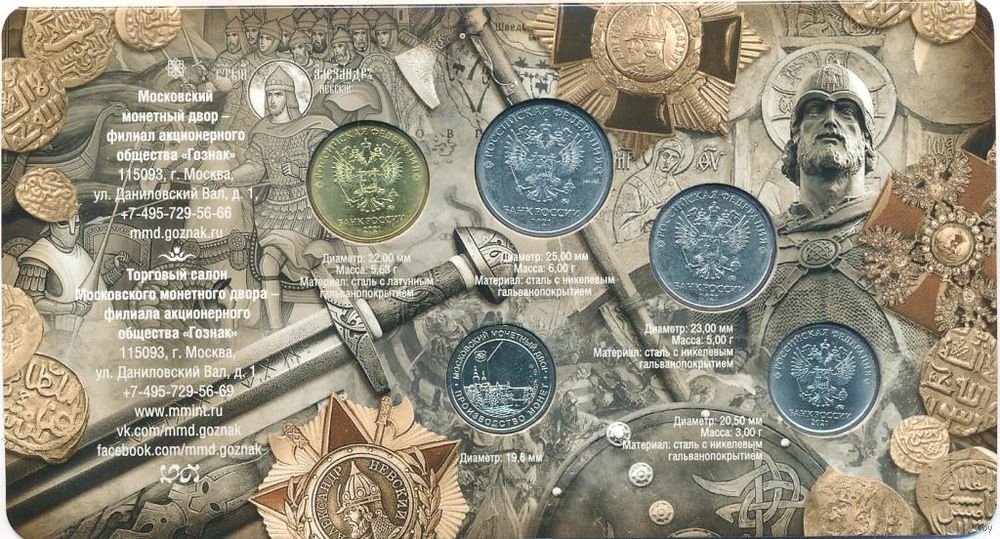 Набор разменных монет Банка России 2021 ММД 10, 5, 2, 1 рублей (4 шт.)+ Жетон Гознак. Александр Невский