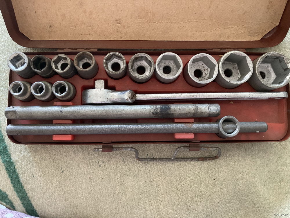 Набор шоферского инструмента № 2 в металлическом боксе ТУ2-035-662-79. Производство Новосибирский инструментальный завод, СССР. Набор сменных головок в полном комплекте и принадлежности к ним. Включает 16 предметов. Набор 13 торцевых сменных головок под квадрат, от 10 мм до 32 мм.
