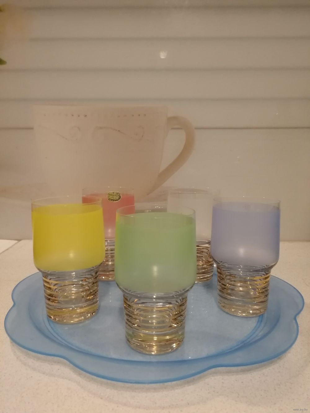 Продаются 5 стаканов цветного богемского стекла и 1 кувшин производства Чехословакия. Раритетные. Заводская упаковка отсутствует. Размеры изделий: стаканы 6*11,5 см; кувшин 10,5*24 см. Минимальная цена 70 рублей.