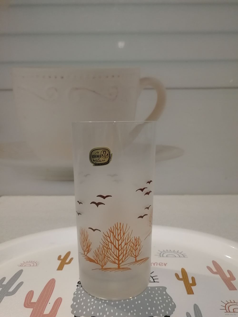 Отдельно продаются стаканы с рисунком (деревья+птицы) в количестве 9 штук. Богемское стекло/Чехословакия. Раритетные. Заводская упаковка отсутствует. Размеры изделия: 6,5*13,5 см. Купить можно любое количество стаканов. Минимальное цена - 9 рублей за 1 стакан.