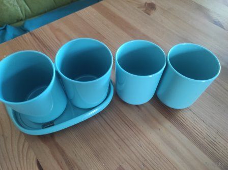 Набор стаканов и полочка в ванную комнату. Цвет бирюзовый. Есть полочка небольшая, которая крепится к стенке клейкой лентой либо на болты (размер 17 на 10 см). Есть 4 стаканчика. Двумя стаканами не пользовалась. Качественный пластик.