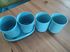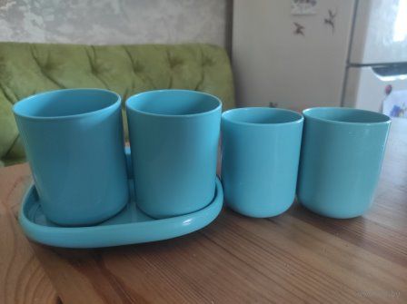 Набор стаканов и полочка в ванную комнату. Цвет бирюзовый. Есть полочка небольшая, которая крепится к стенке клейкой лентой либо на болты (размер 17 на 10 см). Есть 4 стаканчика. Двумя стаканами не пользовалась. Качественный пластик.