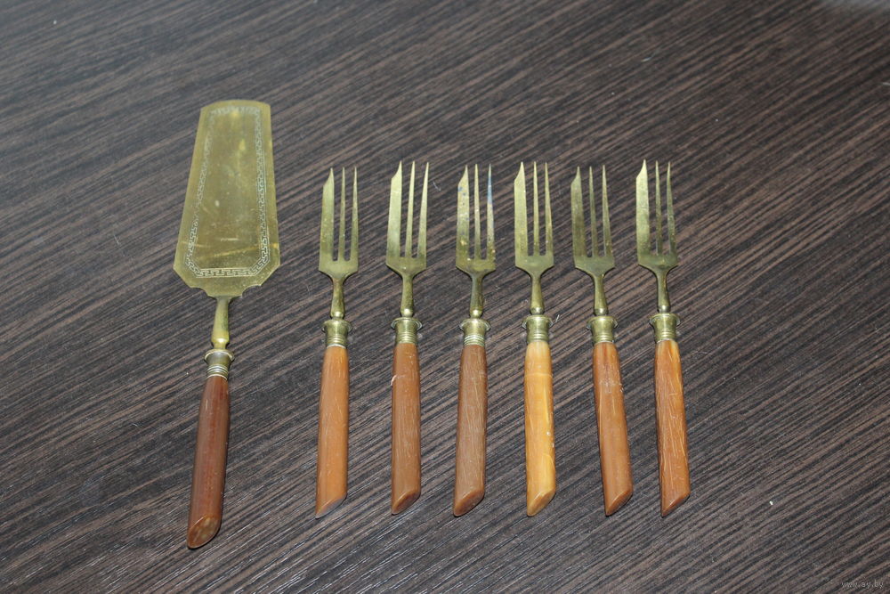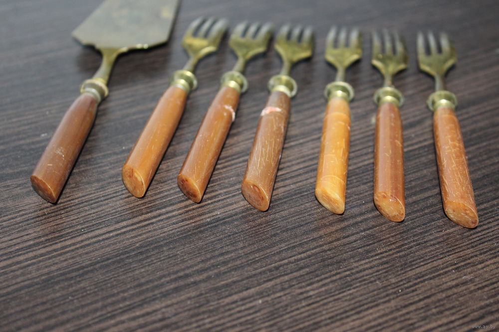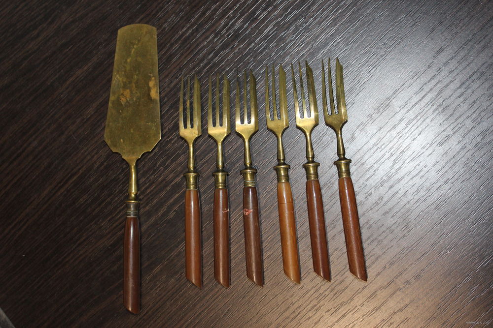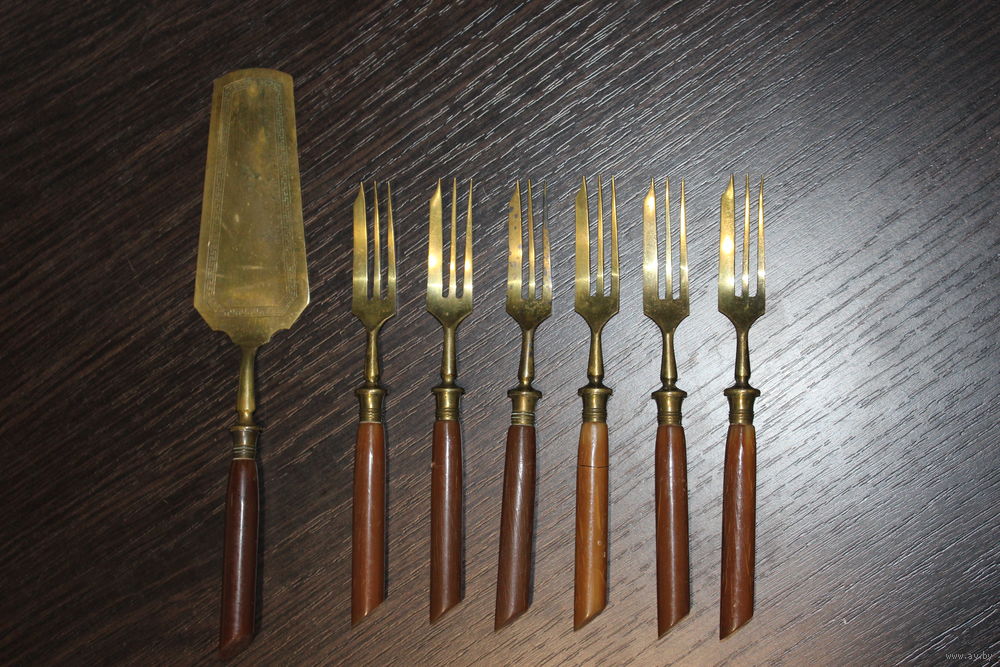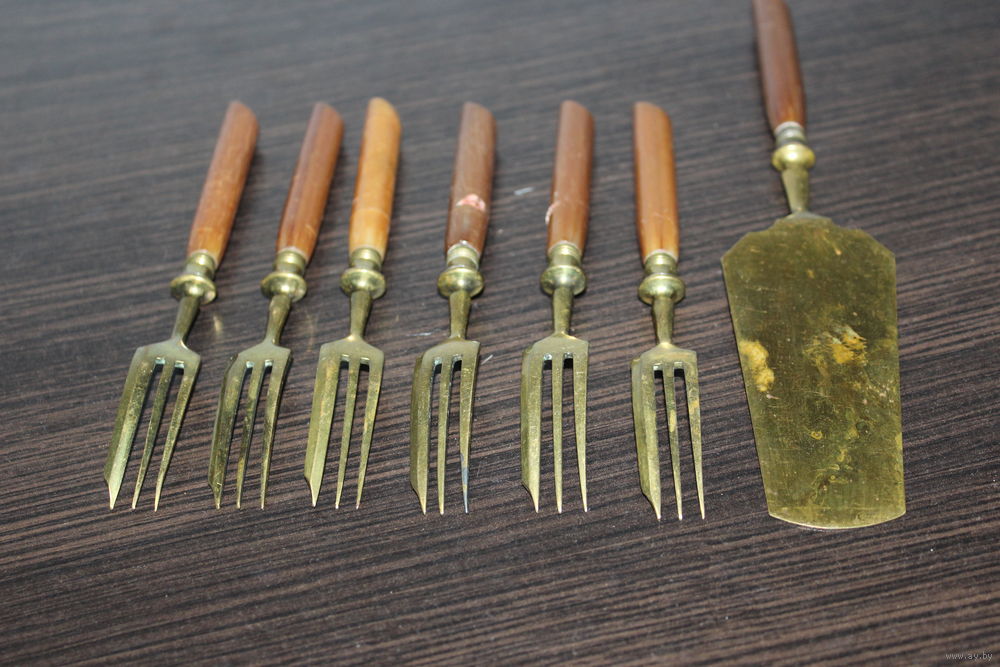 | Присутствуют царапинки, на одной вилке на ручке трещинка, длина вилки 15 см., лопатки 21 см. | |