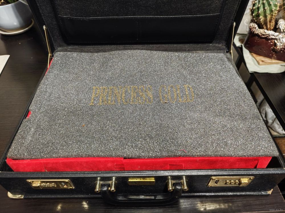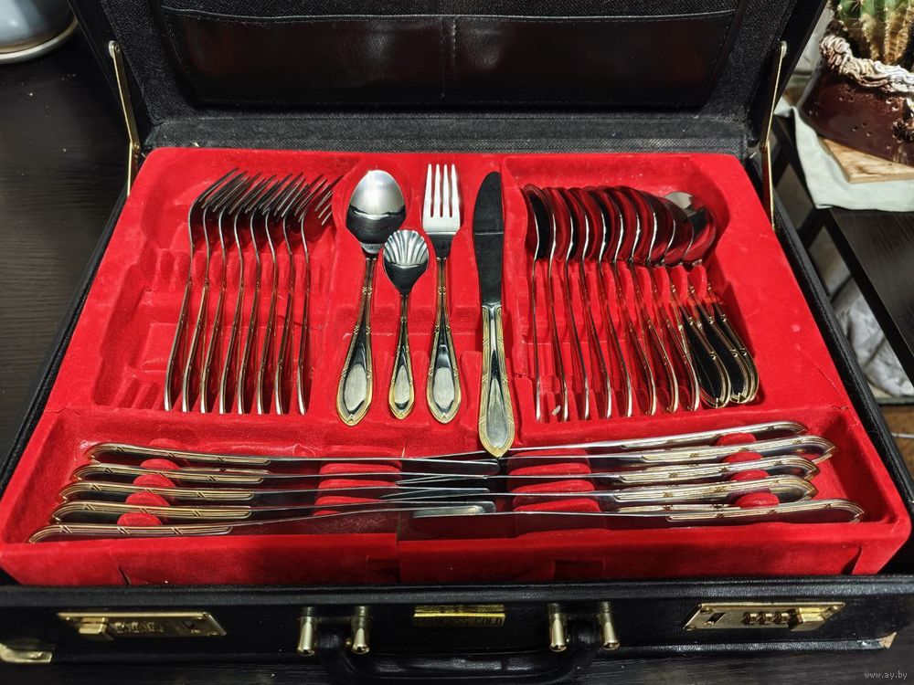 Отличный премиальный фирменный Набор столовых приборов PRINCESS GOLD из 65 предметов. Шикарная нержавеющая сталь 18/10. Вилки и ножи несколько раз были в пользовании, а остальное - безупречно. Из-за этого как подарок наверное вряд ли, лежали несколько лет без дела, основание верхнее красное, как видно на фото, в нескольких местах повреждено немного. Не хватает 2 вилки. А как для себя или для непривередливого друга, самое оно
