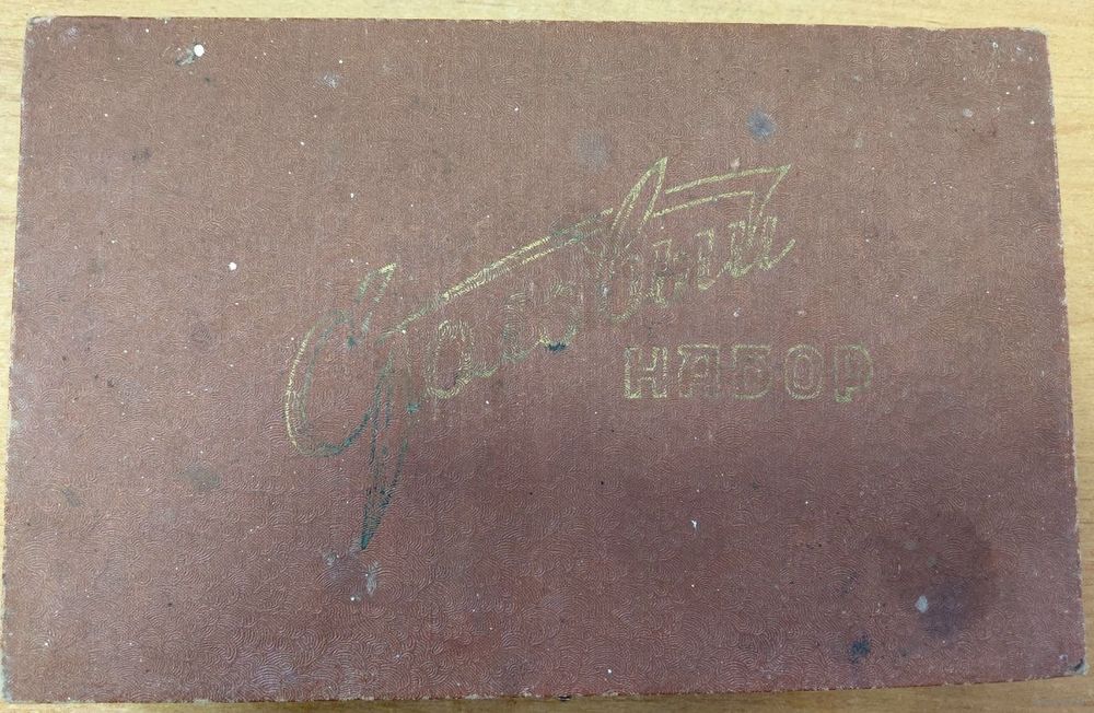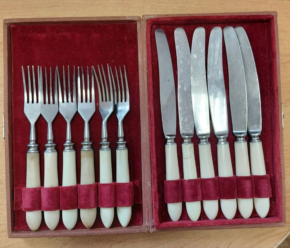 Набор включает в себя 6 столовых вилок и 6 столовых ножей. Приборы находятся в фирменном футляре, с бархатной обивкой внутри.