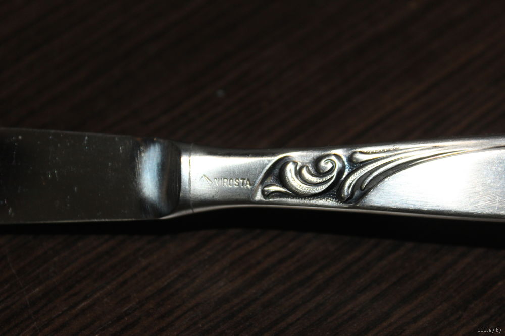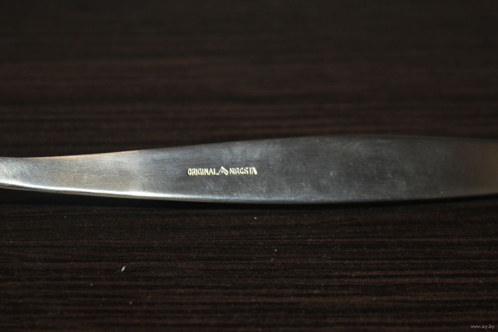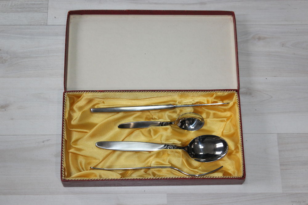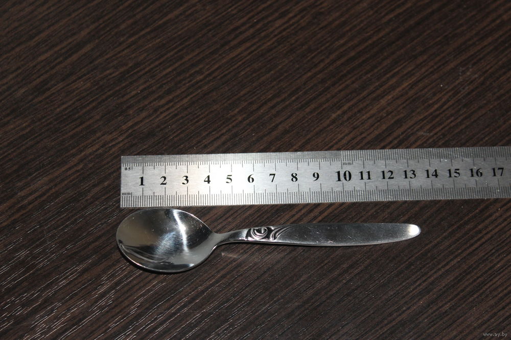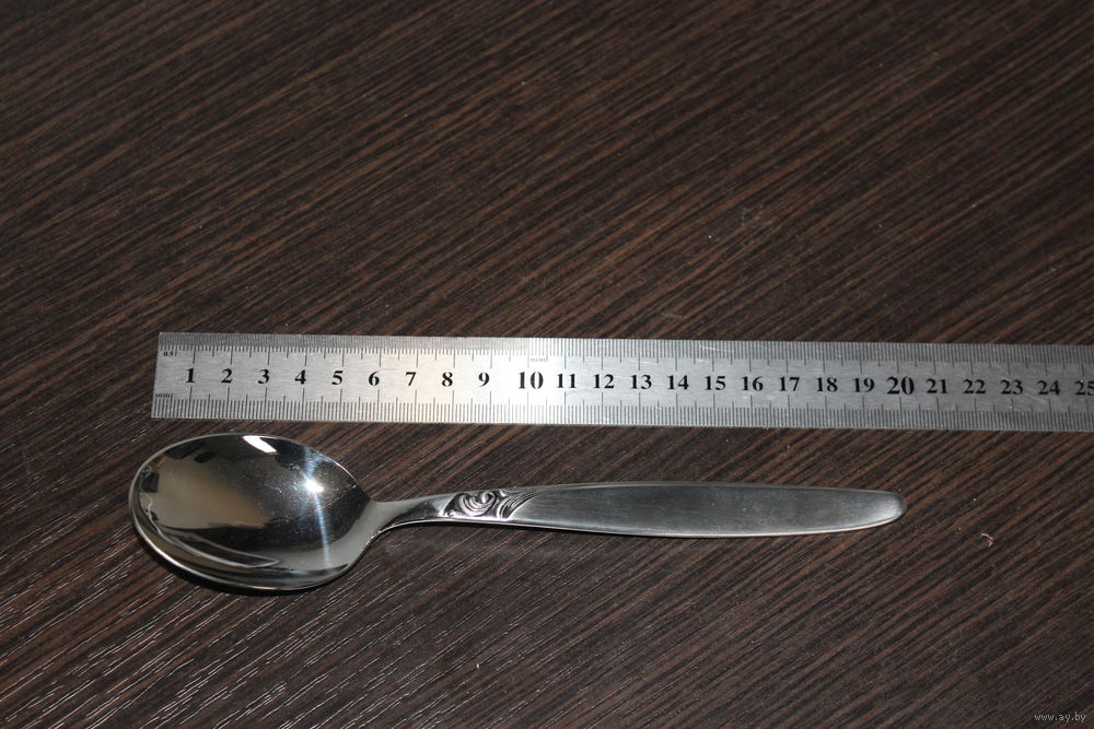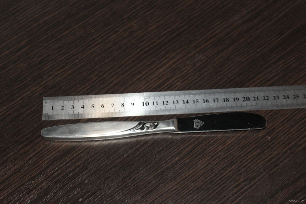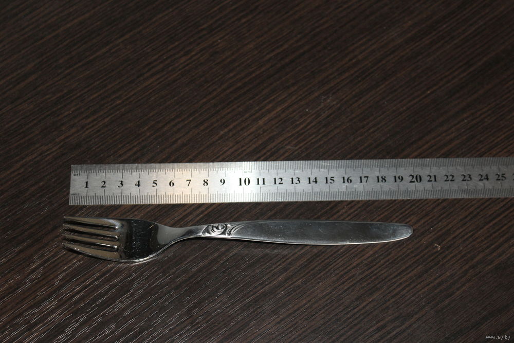 Длина ножа 21,5 см., ложка маленькая 13,3 см., большая ложка 20 см., вилка 19,5 см.