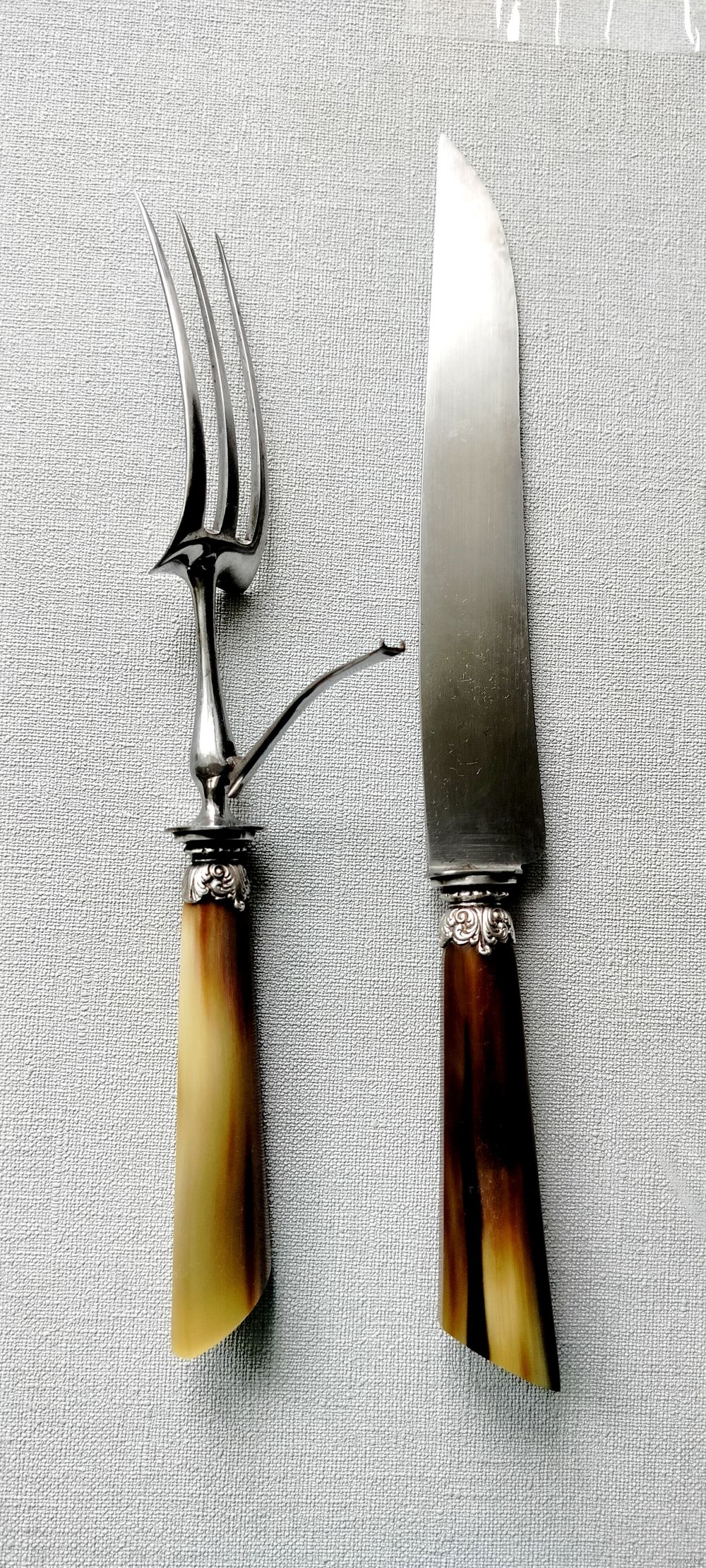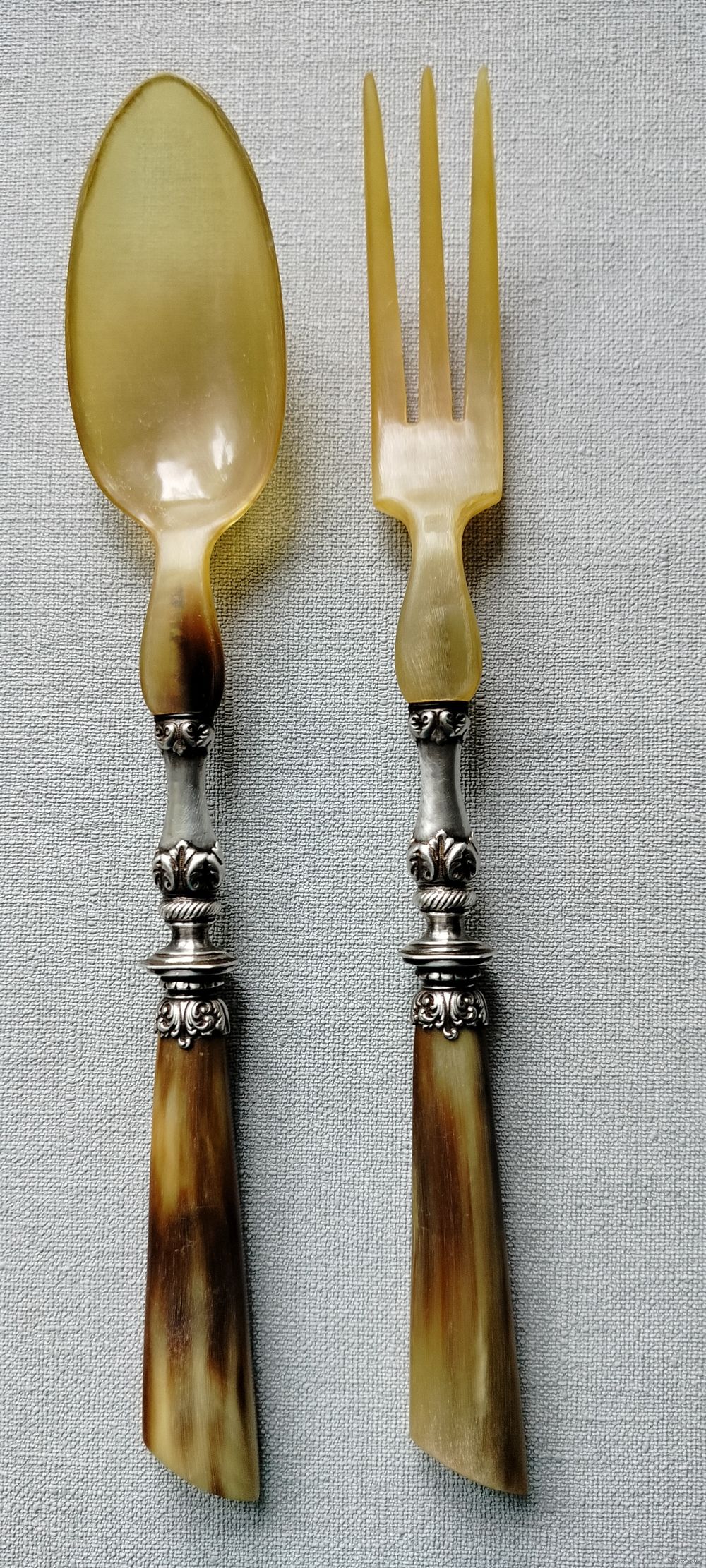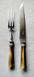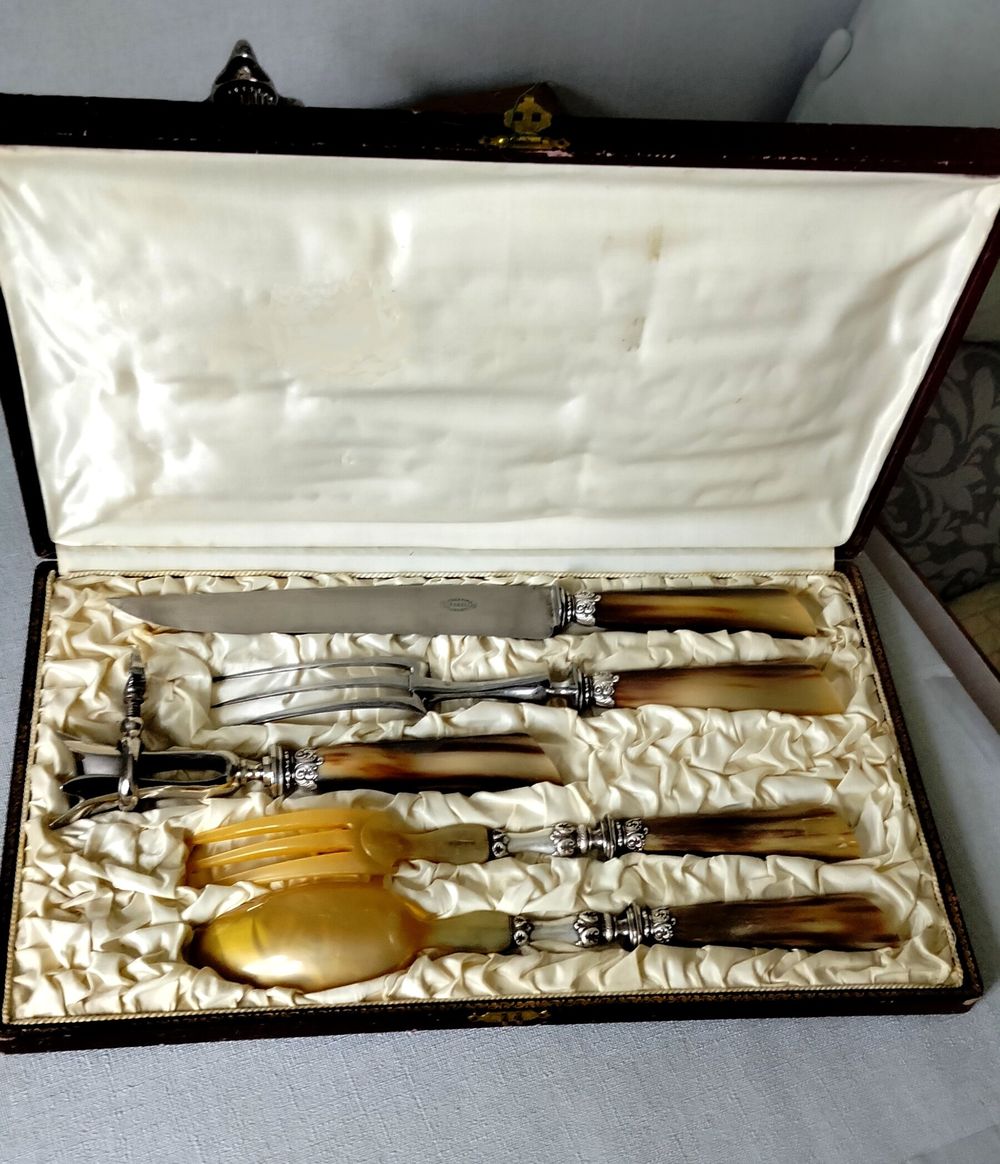 Ручки приборов изготовлены из резного рога с серебряными наконечниками. Рабочая часть вилки и ложки - рог. Рабочая часть вилки и ножа выполнена из высококачественной стали о чем свидетельствует клеймо "Высококачественная сталь" Приборы практически в идеальнос состоянии, несмотря на "возраст". Коробка, к сожалению, имеет значительные следы времени.