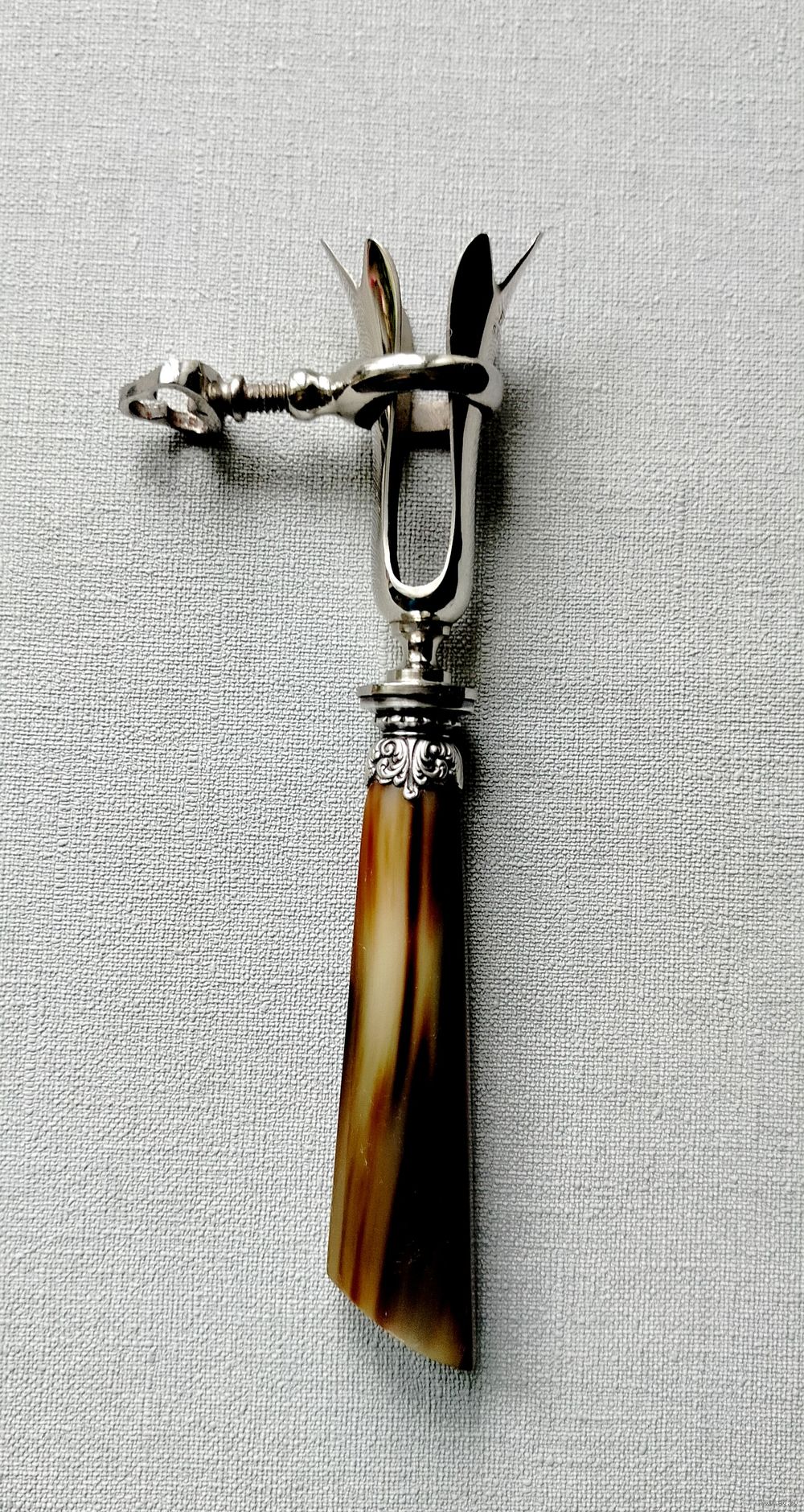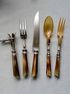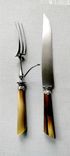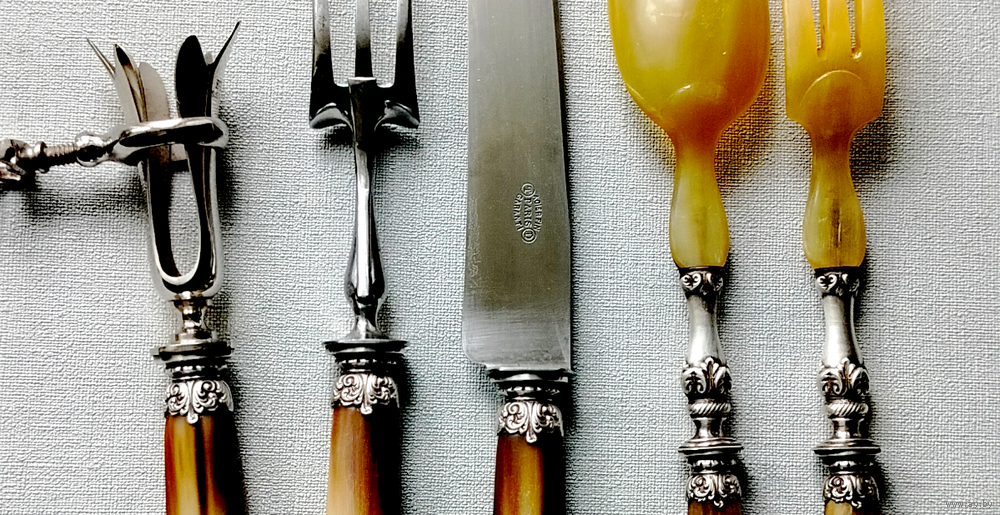 Антикварный набор из пяти предметов. Траншерная вилка с ножом для разделки мяса и дичи. Прибор манш-а-жиго (фр.- manche a gigot) - для удержания мяса при его разделке (запечённой бараньей ноги или подобной по размеру дичи - козла, индейки, косули и т. п.) или окорока. Зажав в струбцине кость, можно изящно и ловко нарезать мясо. Вилка с ложкой в комплекте для удобства подачи салата.