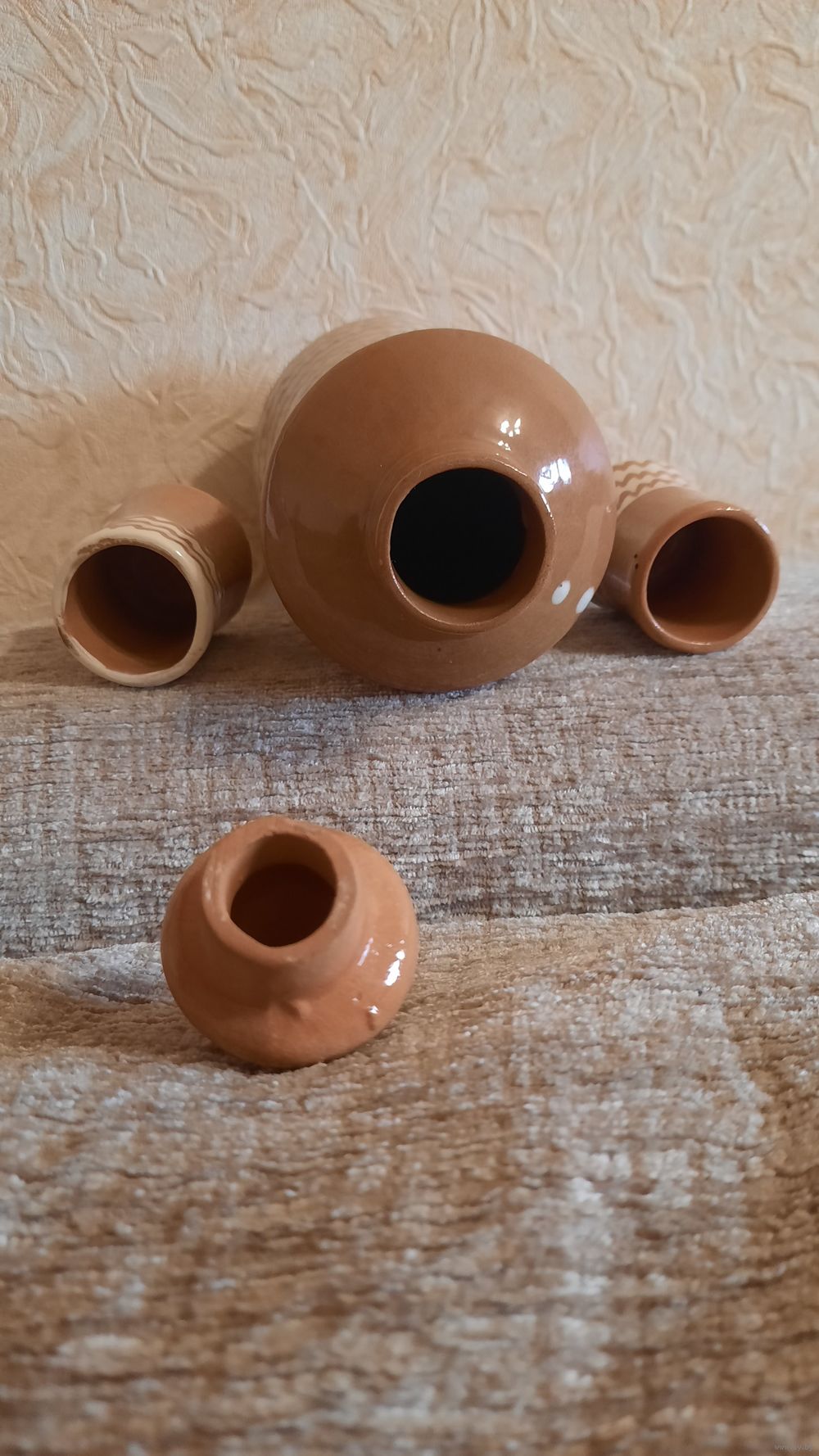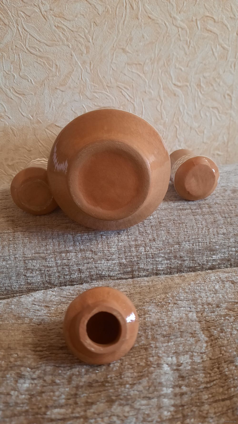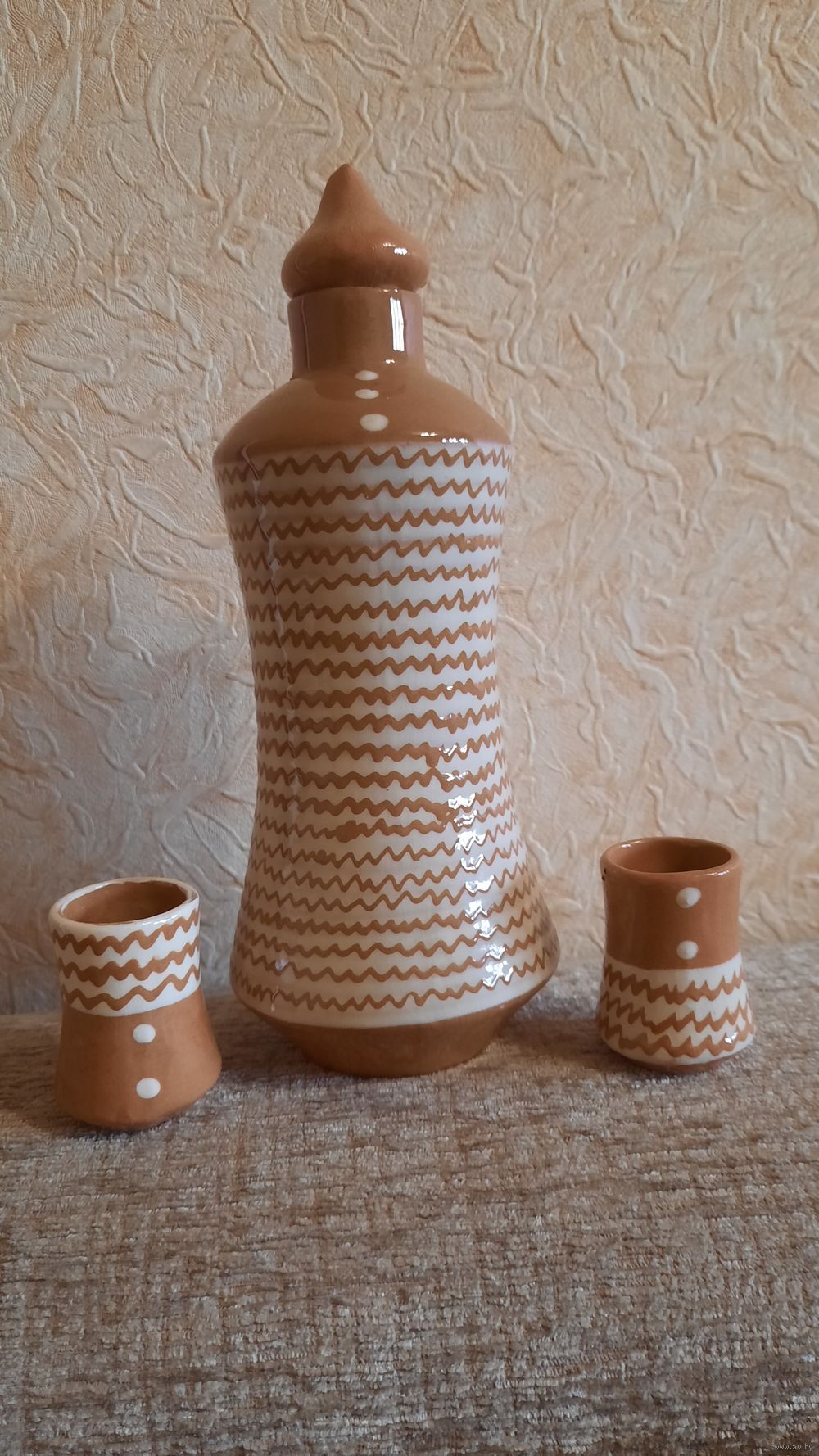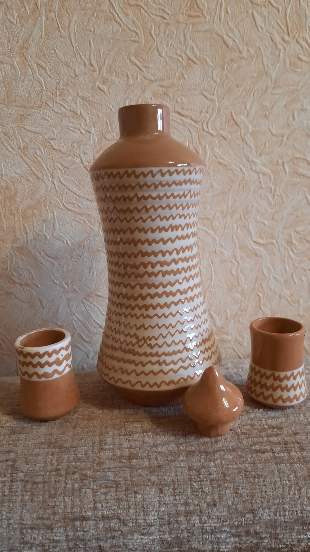 Покупалось при СССР. Возможно в Грузии. Рисунок на стопках ассемитричный , а спереди, как пуговки у бутылки и стопок.