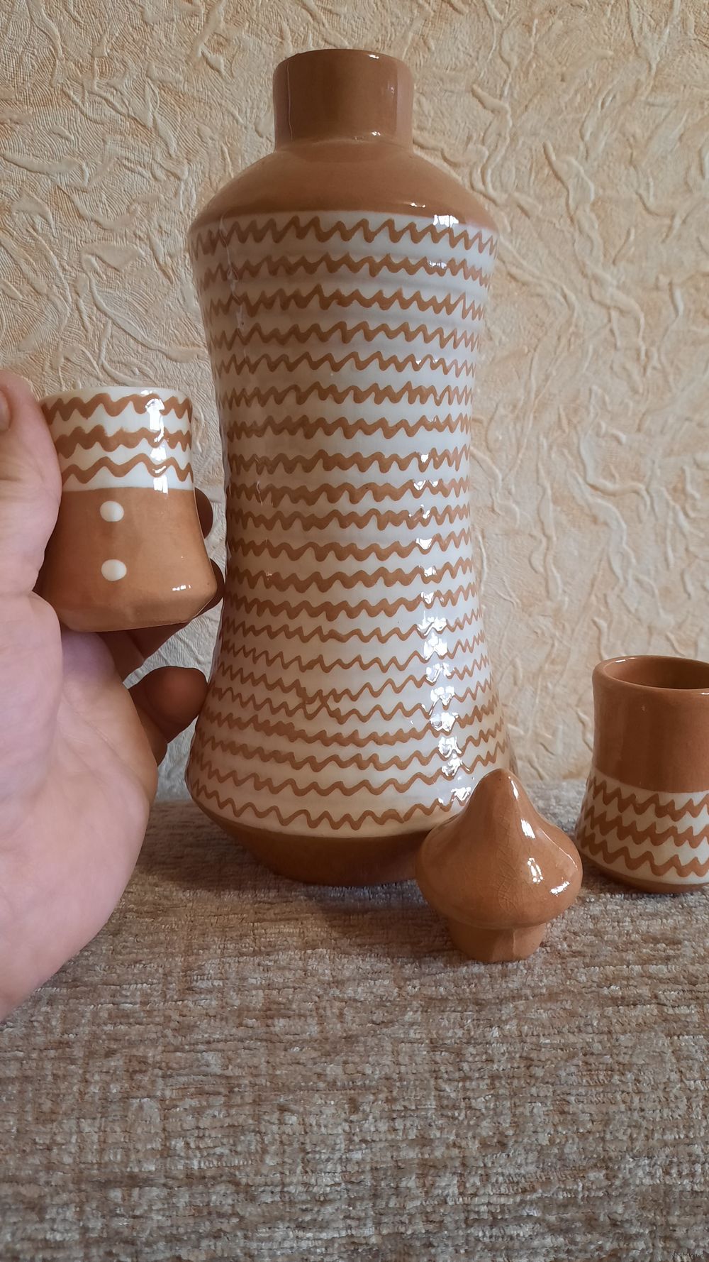 Покупалось при СССР. Возможно в Грузии. Рисунок на стопках ассемитричный , а спереди, как пуговки у бутылки и стопок.