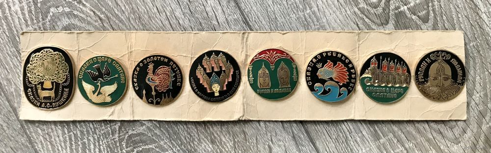 Полный комплект значков «Сказки Пушкина», сделано в СССР. Алюминий, холодная эмаль. Размер прямоугольного значка 5х4см., диаметр круглых 4см. Значки новые, на родной подложке. Продаются комплектом.