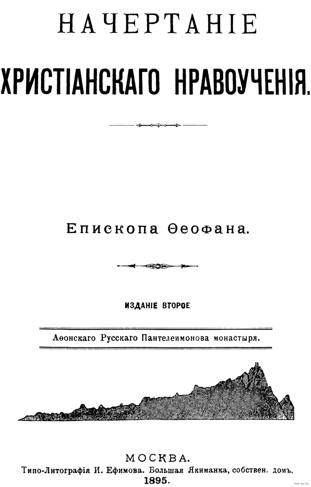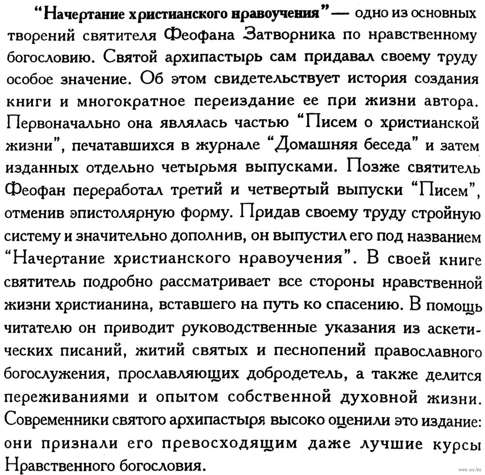 Феофан Затворник "Начертание христианского нравоучения". Придав своему труду стройную систему святитель Феофан подробно рассматривает все стороны нравственной жизни христианина. В последовательном развитии излагаются мысли об исправлении греховного сердца, о христианском самосознании в отличие от нравственного самосознания вообще, учение об обязанностях христианина – семейных, церковных, служебных и гражданских и т.д. Одна из основных мыслей книги – идея Богообщения, составляющая начало, середину и конец христианской нравственной жизни. Современники Феофана Затворника высоко оценили это издание: они признали его превосходящим даже лучшие курсы Нравственного богословия. Автор сам придавал своему труду особое значение. Об этом свидетельствует долгая и тщательная история создания книги и многократные переиздания ее при жизни автора. Феофан Затворник, прослеживая этапы жизни христианина, особое внимание уделяет нравственной стороне и предлагает правила, которыми следует руководствоваться на пути к Богу.