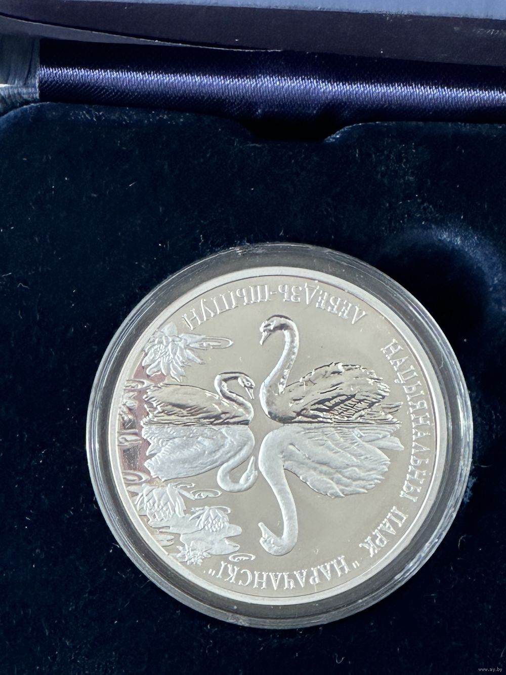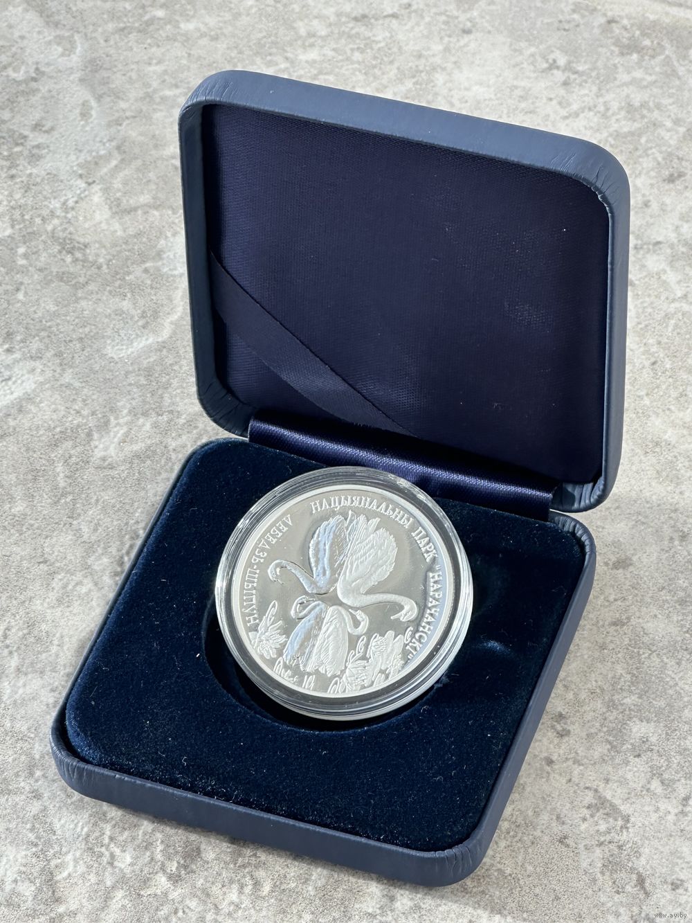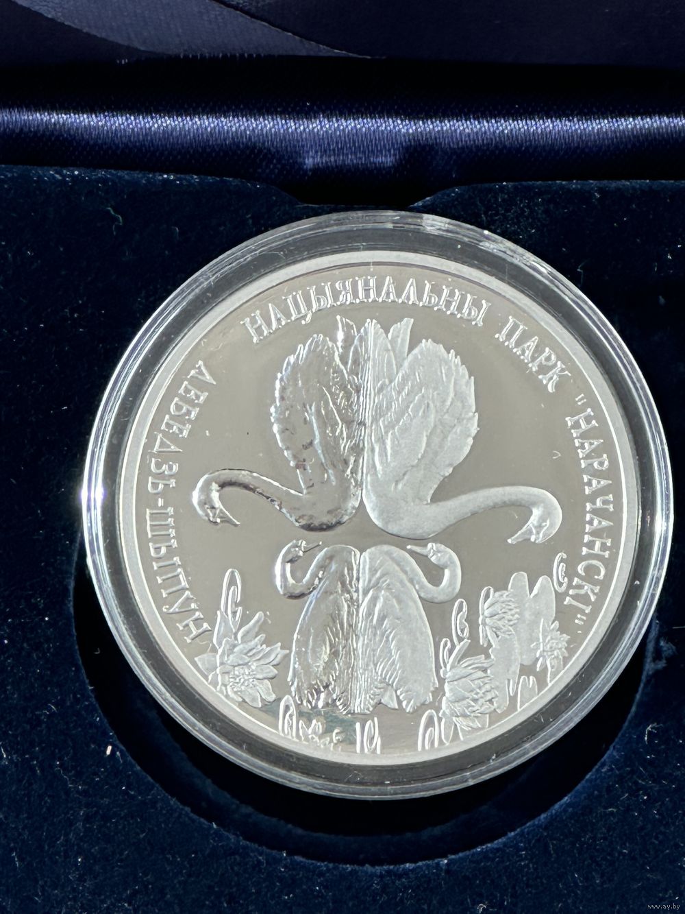 в центре – изображение двух плавающих лебедей на фоне лилий; по кругу надписи: слева вверху – "НАЦЫЯНАЛЬНЫ ПАРК "НАРАЧАНСКІ", внизу – "ЛЕБЕДЗЬ–ШЫПУН".