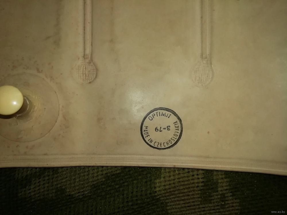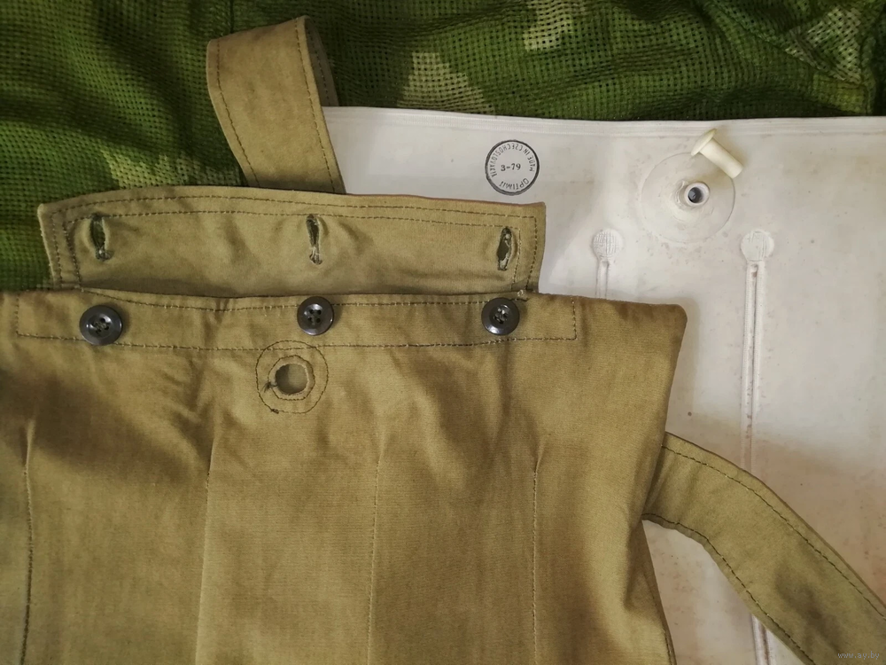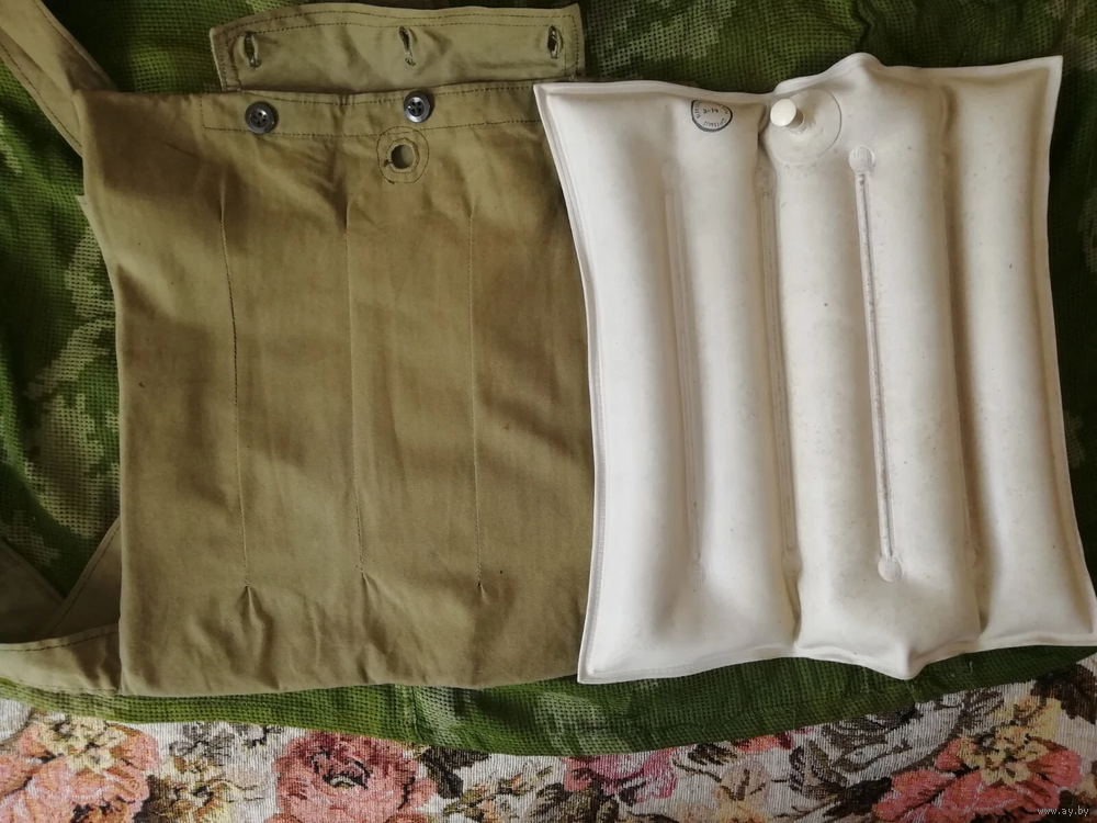 Чехол из хлопка, брезент. Резиновая подушка, пластиковая пробка. Ребристая подушка с жесткими ребрами. Возможно, для перевозки ребенка в поездке. Возможно, для снятия напряжения в спине при поездке на автомобиле или в путешествии. Может использоваться для изоляции места травмы во время перевозки пострадавшего. В целом, характеристика товара неизвестна.