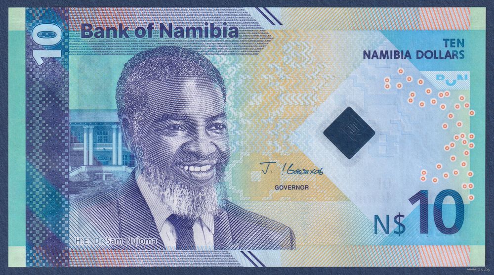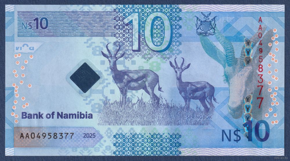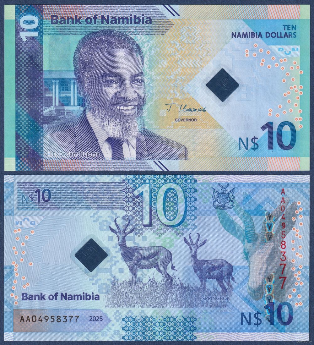 Намибия, 10 долларов 2025 г., P-W20 (AA, президент Сэм Нуйома, газель спрингбок), UNC