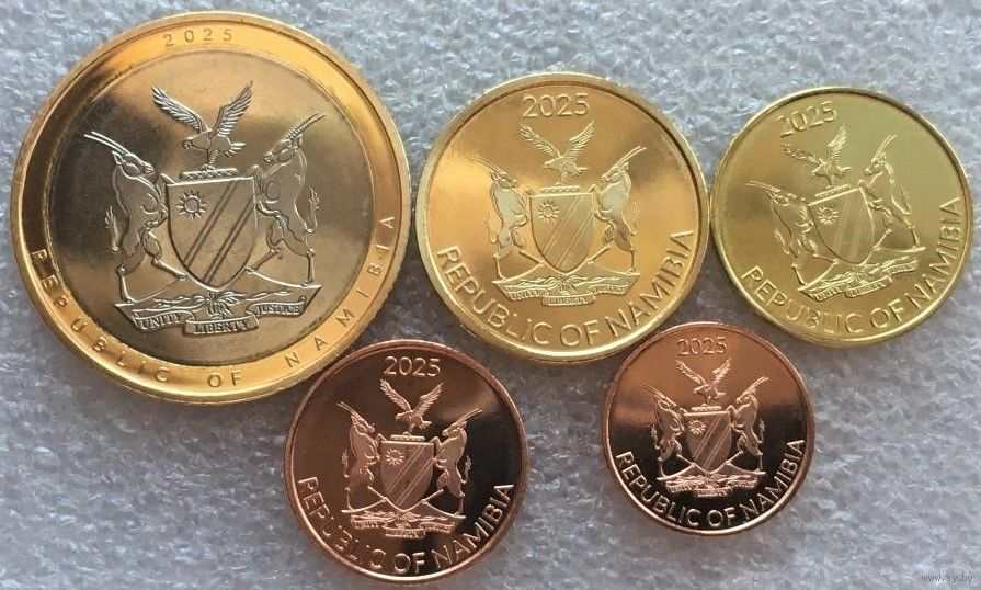 Намибия. 5 долларов 2025 год UC # 210 Валюта: Доллар Намибии Материал: Би-металл: центр - сталь с никелевым покрытием, кольцо - сталь с латунным покрытием Вес (g) 6.9 Диаметр (mm) 29.0 Толщина (mm) 1.6