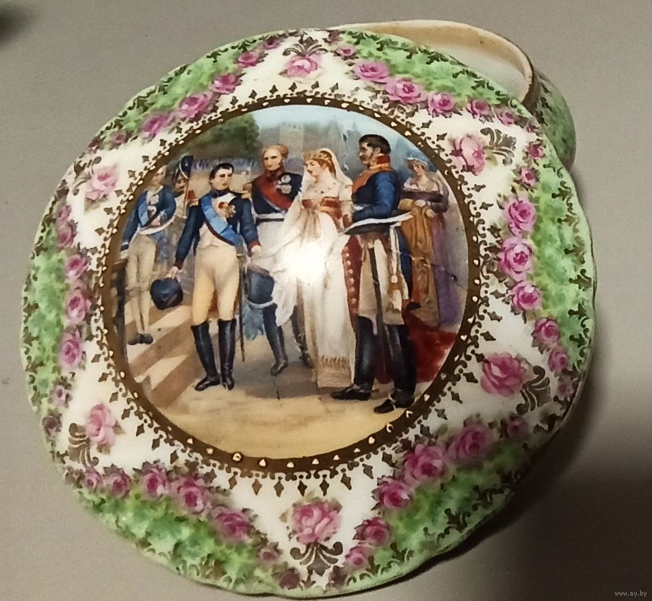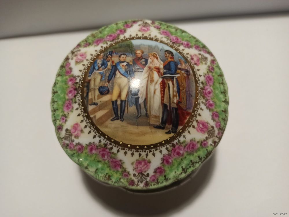 Наполеон в Тильзите. Фарфоровая шкатулка, конец 19 -начало 20 века , состояние отличное см. на фото., диам. 100 мм. Зап. Европа. Фарфор, крытье, ручная цветная роспись, деталировка золочение 22К. Марки золотом корона и “N”. Встреча трех императоров (Наполеон I, Александр I, Луиза Прусская, Фридрих Вильгельм III). «Тильзитское свидание 1807 года», Н. Госс. Оплата Наличные, Банковский перевод, Банковская карта, Контакт. Спасибо за интерес к лоту. Телефон для связи указан в контактных данных, вопросы и предложения желательно присылать через Viber. Передача предмета и получение денег в г.Минске, возможна встреча в рабочие дни по договоренности в центре города. Расчет наличными с продавцом при получении лота. Во избежании недорозумений с пересылкой и проблем с повреждением данный лот по почте не отправляю. Если у Вас есть другие варианты - предварительно оговаривайте их по телефону.