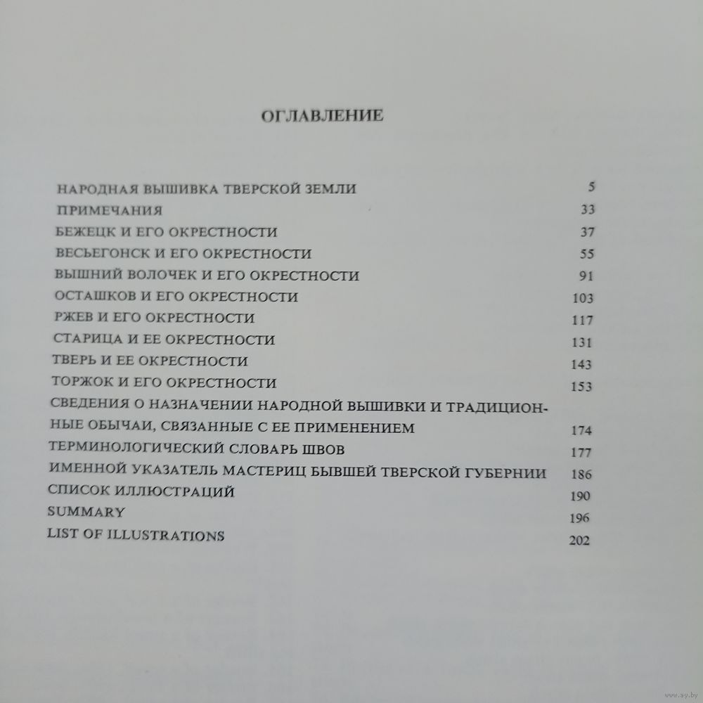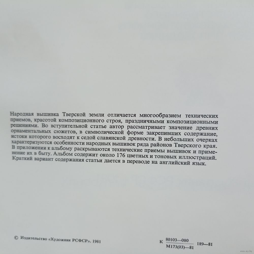 Народная вышивка Тверской земли отличается многообразием технических приемов, красотой композиционного строя, праздничными композиционными решениями. Во вступительной статье автор рассматривает значение древних орнаментальных сюжетов, в символической форме закрепивших содержание, истоки которого восходят к седой славянской древности. В небольших очерках характеризуются особенности народных вышивок ряда районов Тверского края. В приложении к альбому раскрываются технические приемы вышивок и применение их в быту. Альбом содержит около 176 цветных и тоновых иллюстраций
