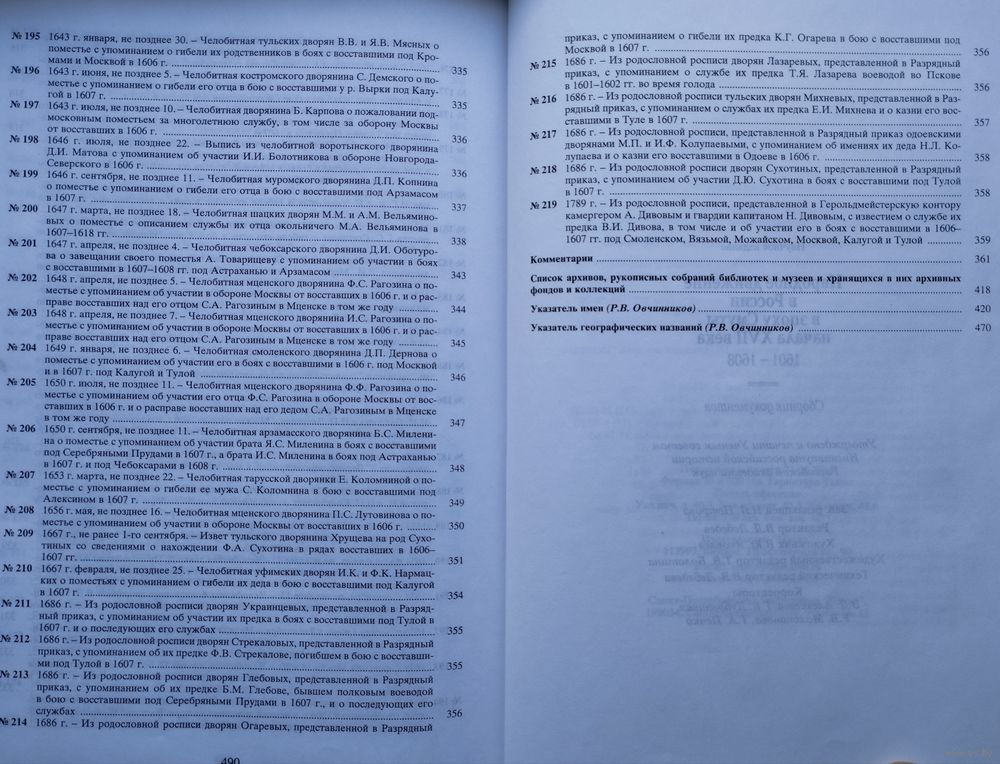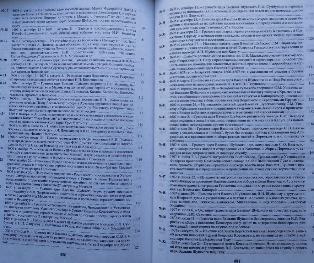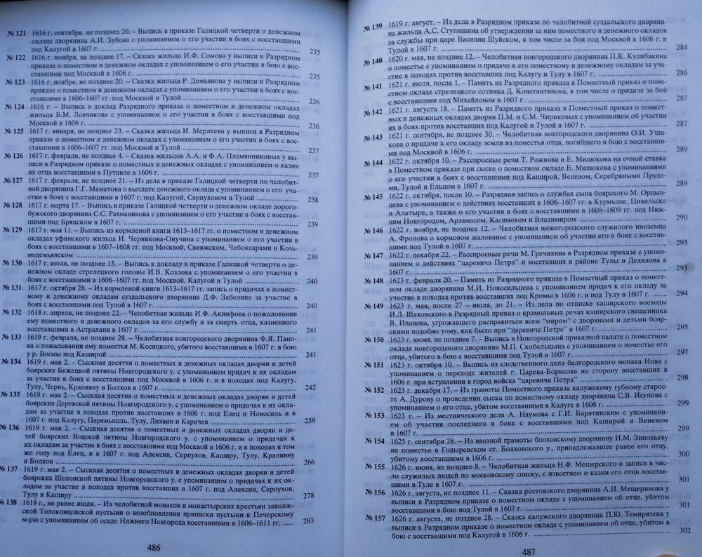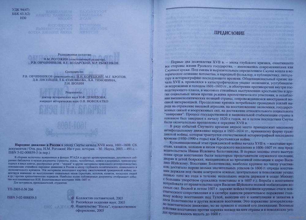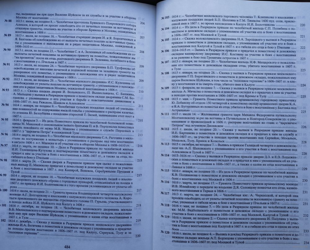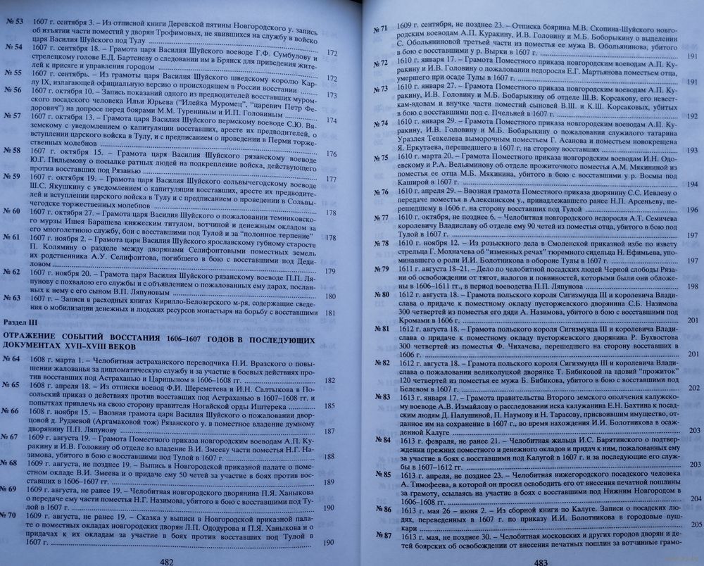 Большой энциклопедический формат. Тираж 570 экз. 498 стр. Включены выявленные в фондах РГАДА и других архивохранилищах, рукописных собраниях библиотек и музеев документы (грамоты, указы, челобитные, записи в разрядных, приходно-расходных и иных книгах, расспросные речи и другие материалы приказного делопроизводства), освещающие народное движение в эпоху кризиса. Материалы воссоздают картину ожесточенной Гражданской войны социальных низов (крестьян, холопов, посадских людей) против крепостнических порядков. Отображается ход восстания Болотникова.