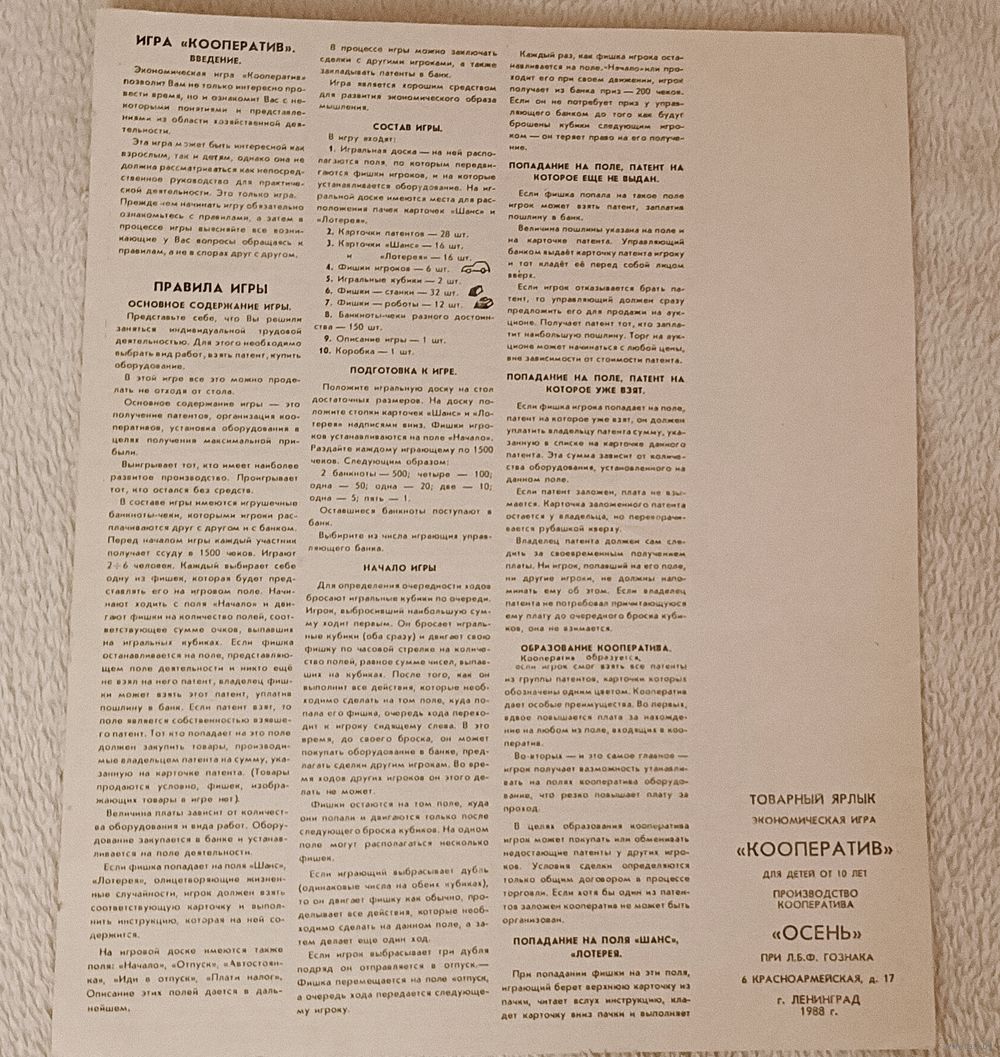 Настольная экономическая игра Кооператив, 1988.
