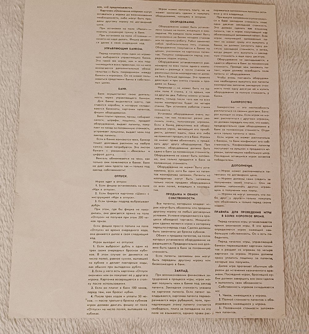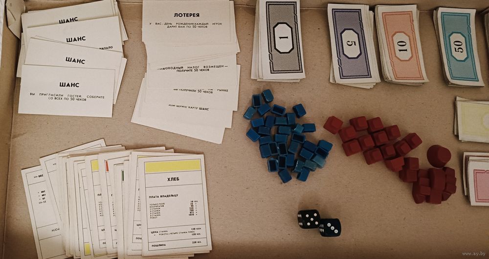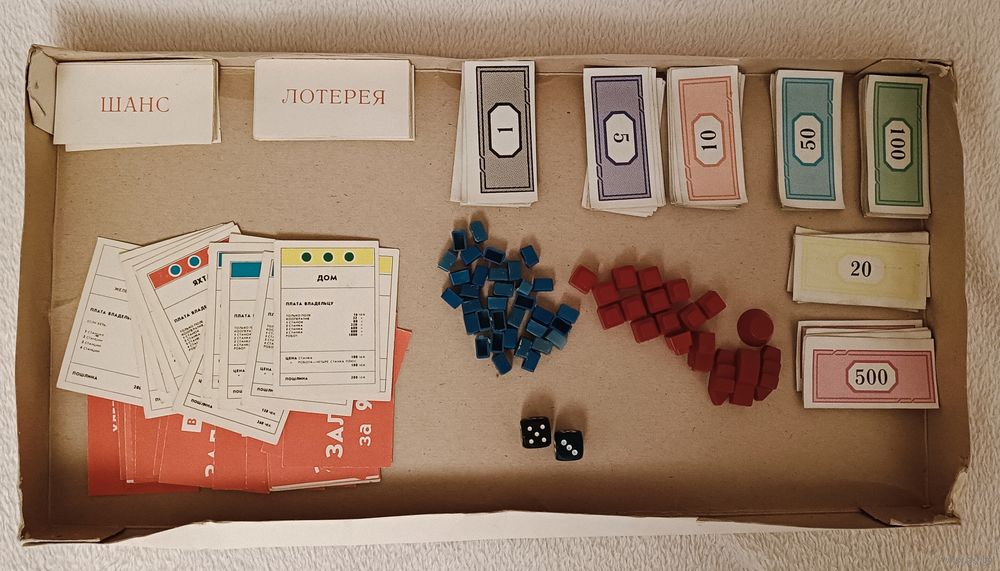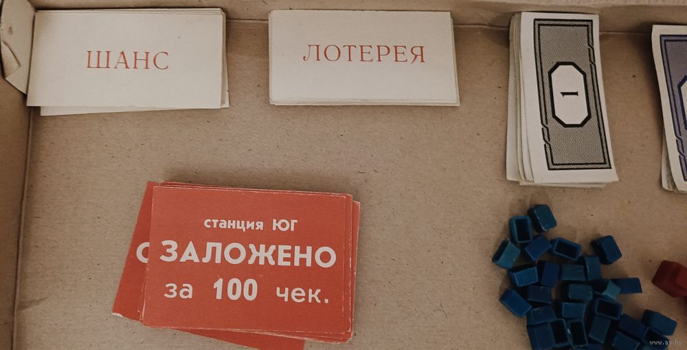 Комплектность игры практически вся сохранилась и в наличии, карточки, банкноты и игровое поле в хорошем состоянии, смотрите фото.