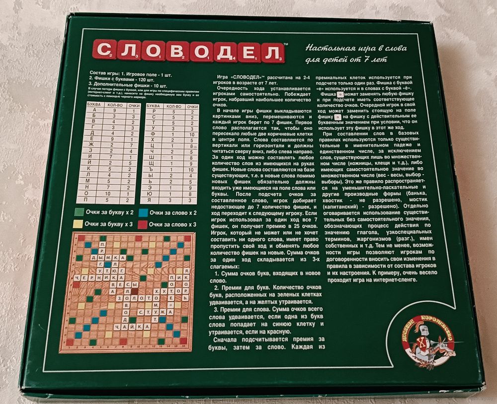 Словодел представляет собой клееное картонное поле 27х27 см (256 клеток), 120 фишек с буквами и 10 штук запасных фишек в клееной картонной коробке. Игра рассчитана на 2-4 игроков. Рекомендуемый возраст - от 7 лет.