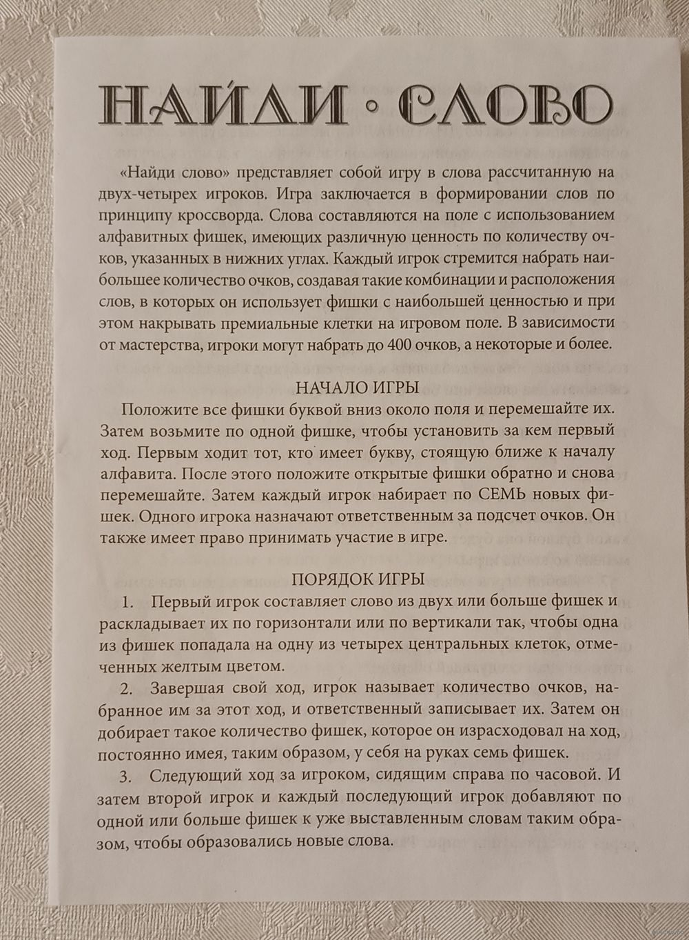 Очередность хода устанавливается игроками самостоятельно. Побеждает игрок, набравший наибольшее количество очков. В начале игры фишки выкладываются картинками вниз, перемешиваются и каждый игрок берет по 7 фишек. Первое слово располагается так, чтобы оно пересекало любые две коричневые клетки в центре поля. Слова составляются по вертикали или горизонтали и должны читаться сверху вниз, либо слева направо. За один ход можно составлять любое количество слов из имеющихся на руках фишек.
