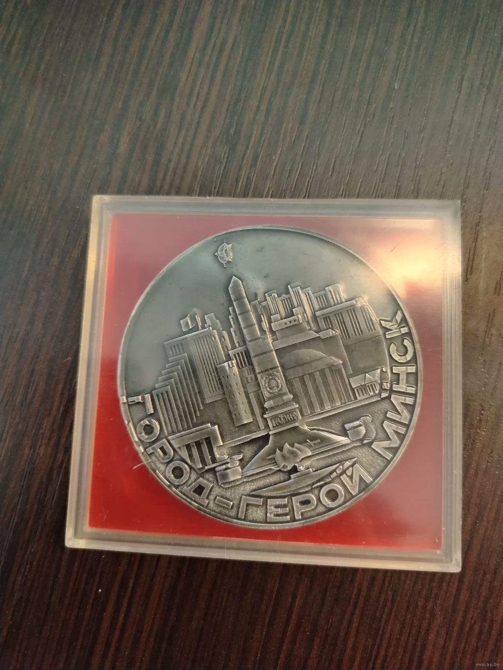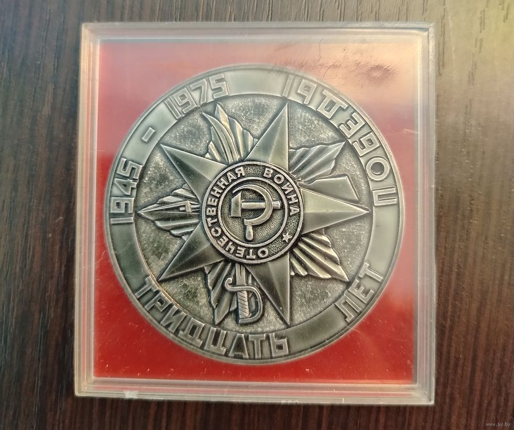 Настольная медаль , посвященная 30 летию Победы в Великой Отечественной войне и присвоению Минску звания Город-Герой материал алюминий диаметр 75мм год выпуска 1975 г в футляре .