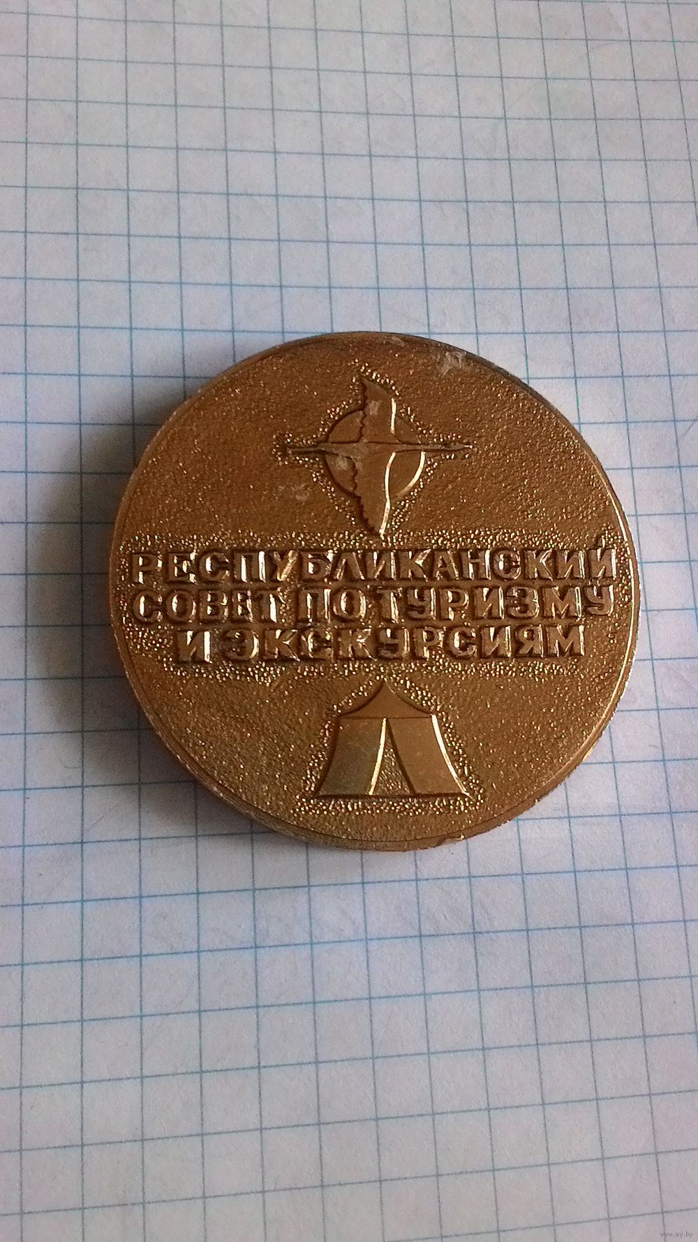 Заглавная медаль серии настольных медалей, посвящённых областным советам по туризму и экскурсиям БССР.