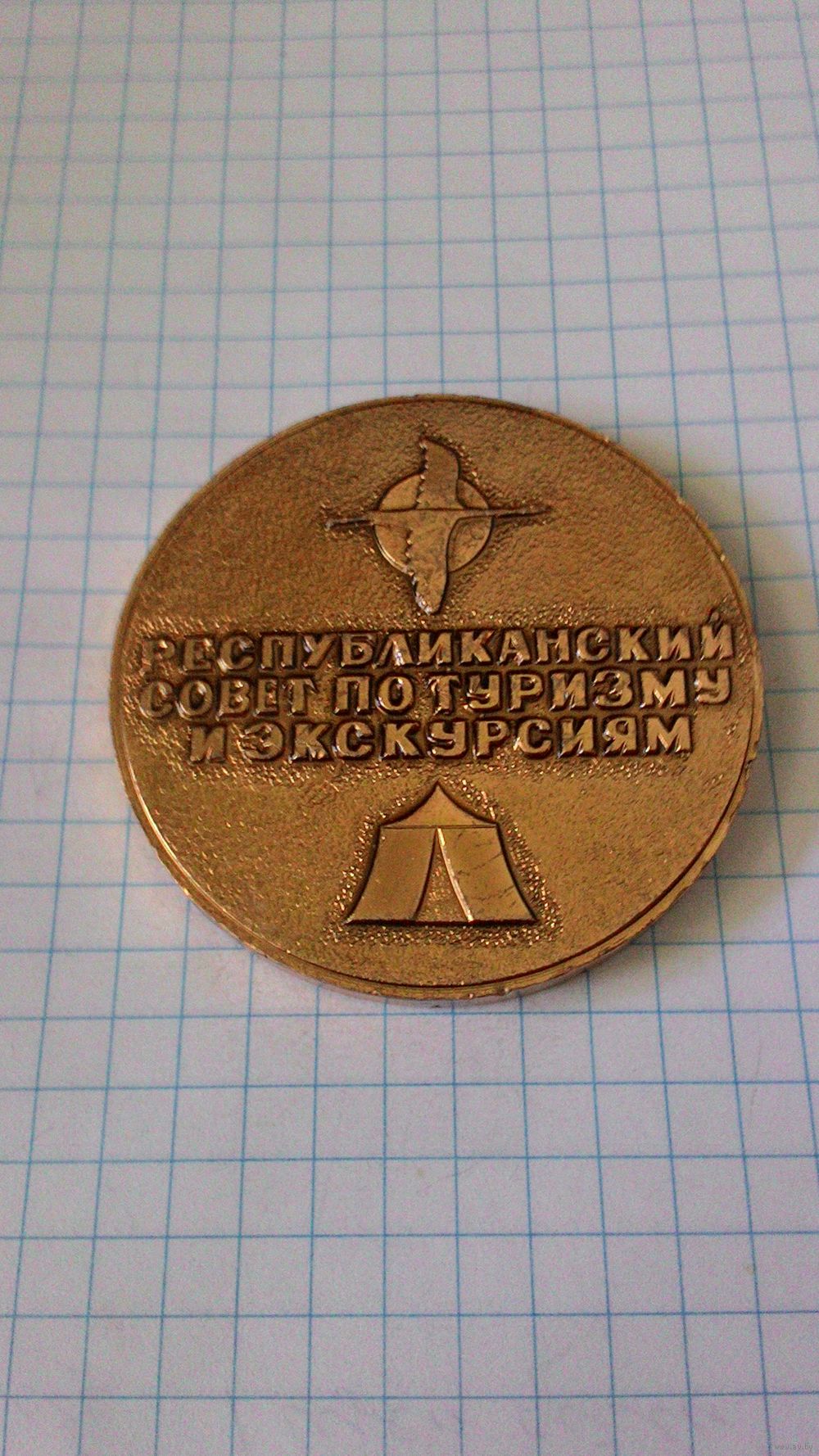 Заглавная медаль серии настольных медалей, посвящённых областным советам по туризму и экскурсиям БССР.