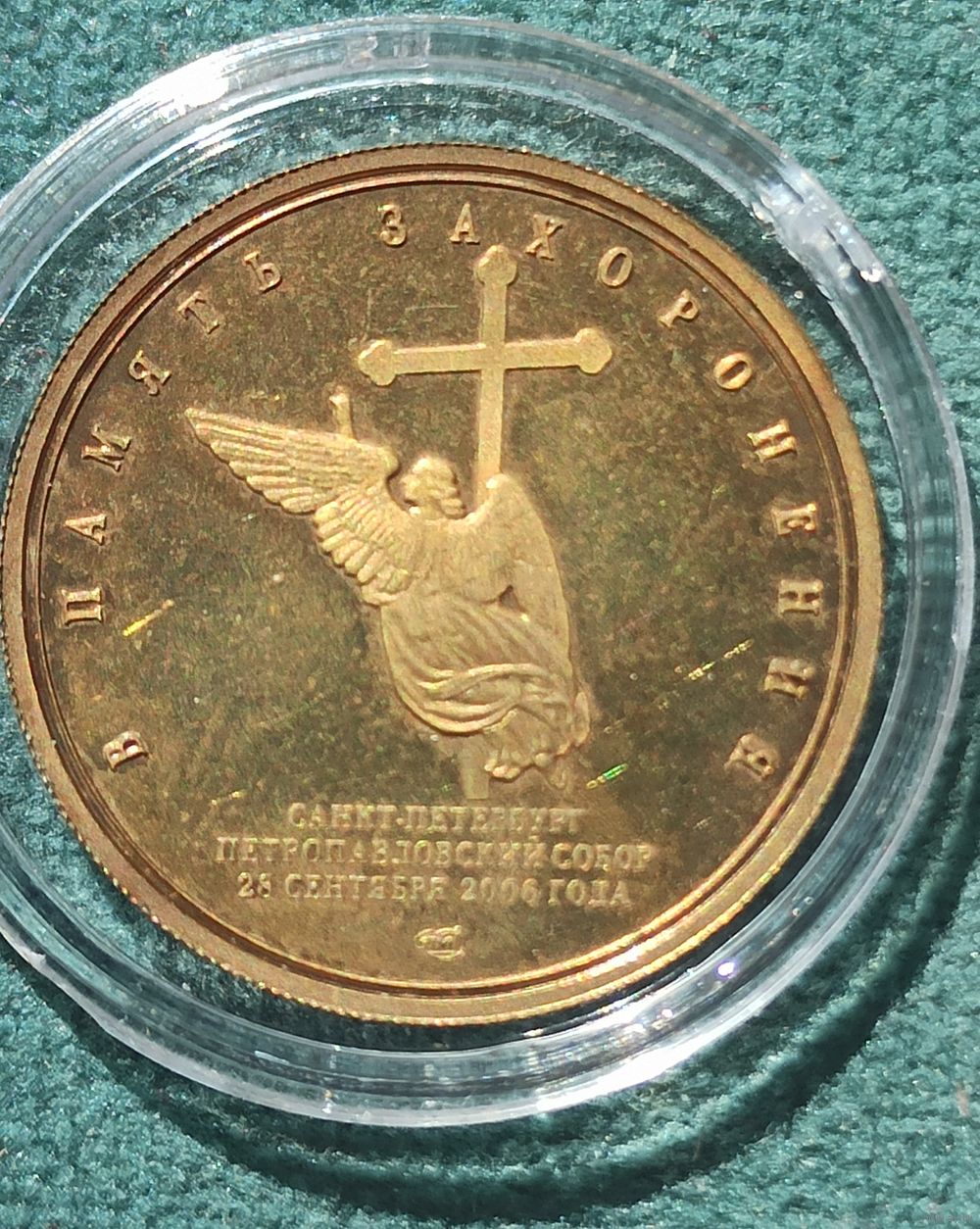 Томпак. 67,51г. Диаметр 50 мм. Санкт-Петербургский монетный двор. Аверс: современной памятной медали отчеканен со штемпеля медали Женского педагогического института. Реверс: изображение ангела со шпиля Петропавловской крепости. Автор эскиза - художник СПМД Антон Щаблыкин, по окружности выполнена надпись: "В ПАМЯТЬ ЗАХОРОНЕНИЯ". Внизу — надпись: "САНКТ-ПЕТЕРБУРГ. ПЕТРОПАВЛОВСКИЙ СОБОР. 28 СЕНТЯБРЯ 2006 ГОДА". BU.