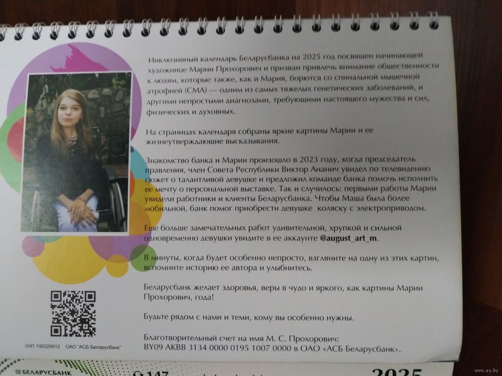 | Инклюзивный календарь с работами начинающей художницы Марии Прохорович. У Марии диагностирована спинально мышечная атрофия (СМА), но девушка полна позитивом, мужеством и творческими замыслами. | |