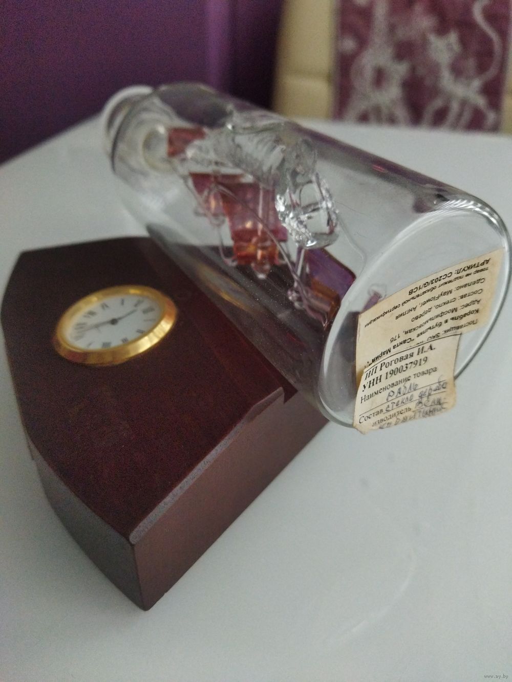 Размер бутылки -18 см.Без пробки. Диаметр - 5,5. Деревянная подставка.