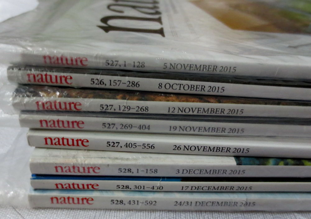 Nature (Природа), журналы, 8 шт. за одну цену. Октябрь, ноябрь, декабрь 2015 г. Английский язык. Почти все журналы в оригинальной целлофановой упаковке (вскрыта). Хорошее состояние. См.описания лота.
