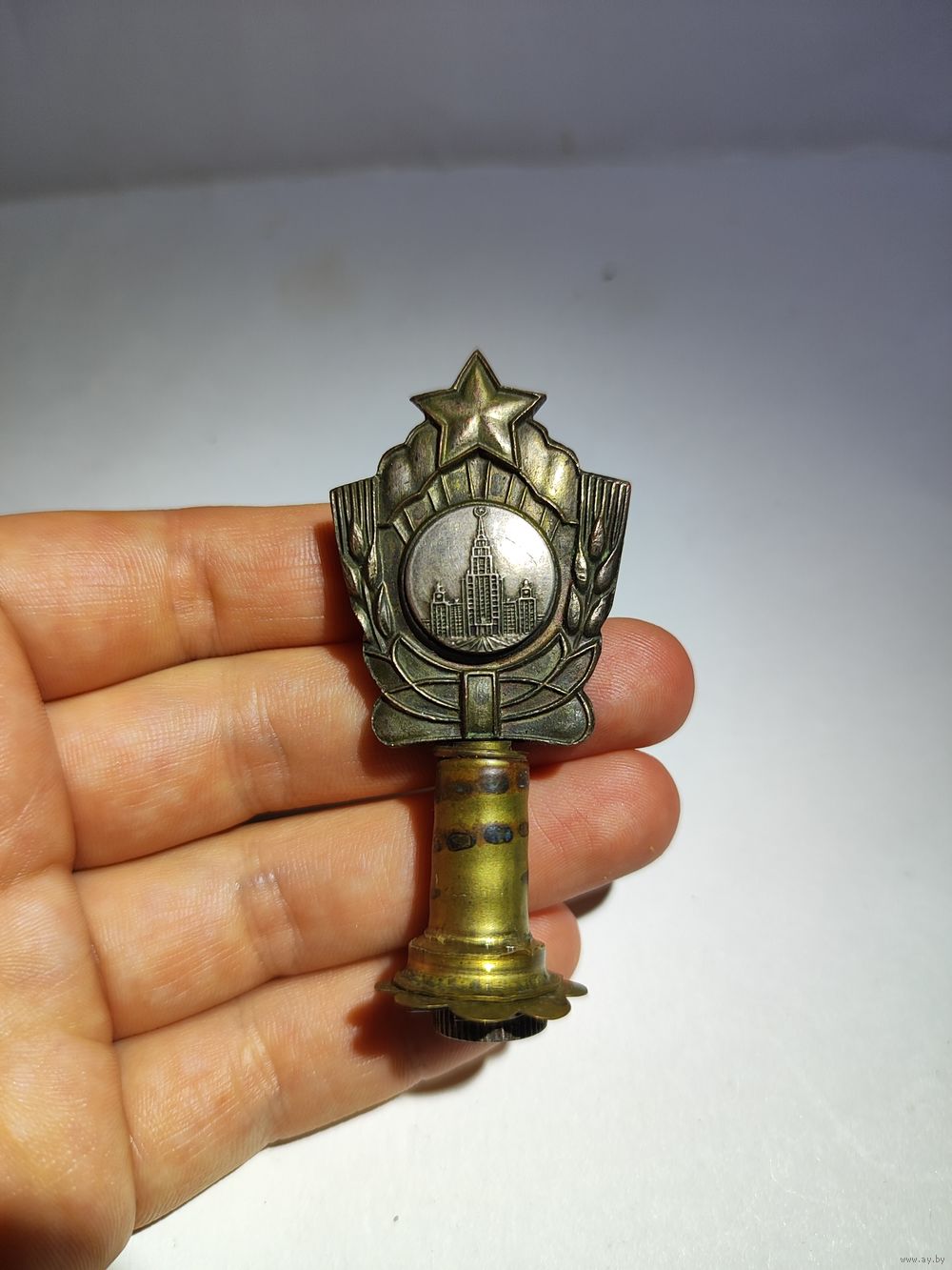 Верх мельхиор -вставка внизу латунь. Высота 7 см. Ширина 3 см.(в широкой части). Состояние на фото.