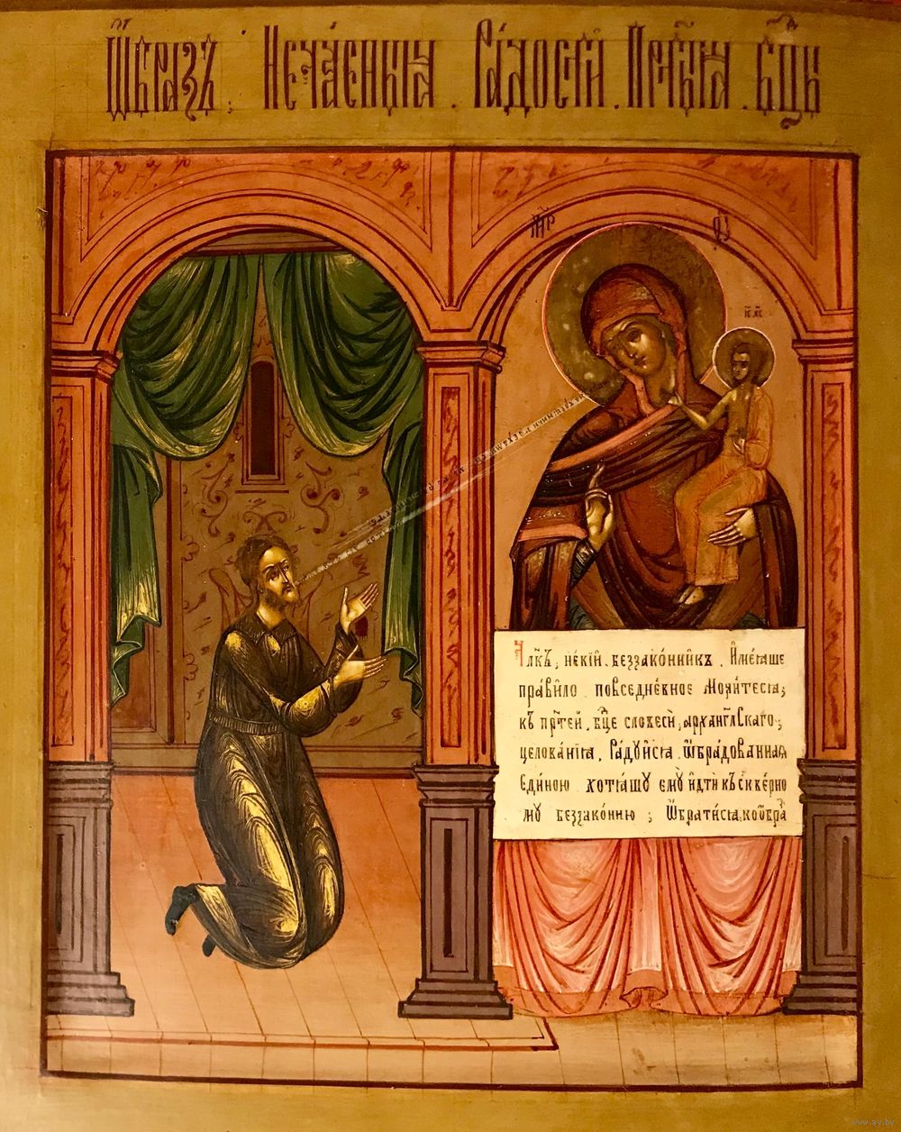 Икона "Нечаянная Радость Пресвятой Богородицы". Владимировские сёла (Палех), XIX век. Размеры: 35,5х31 см.