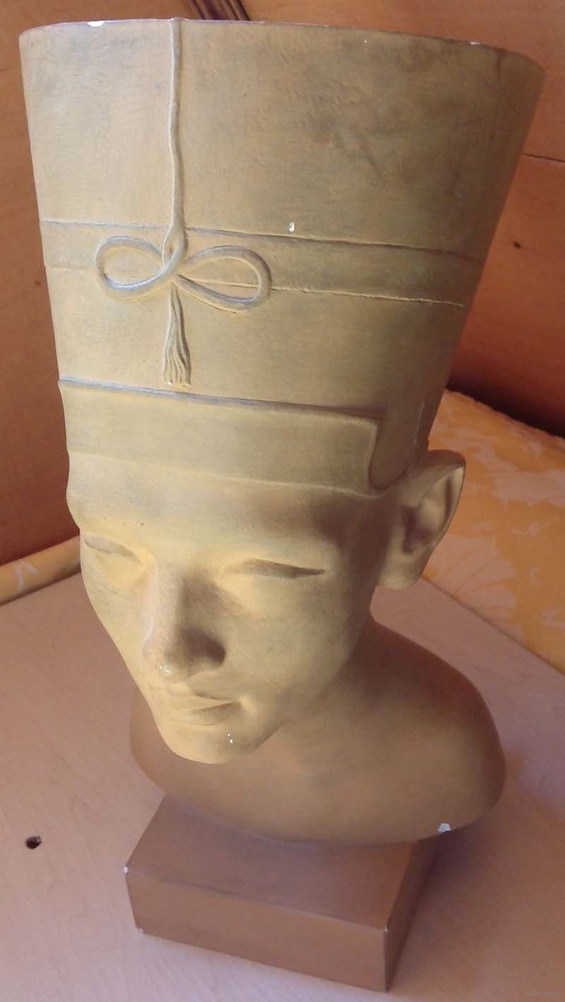 На сколько я понимаю - крашенный гипс. Увесистая. Габариты явствуют из сравнительного фото рядом с обычной книжкой. Несколько не значительных дефектов (царапин и мелких сколов, что по гипсу отреставрировать не составит труда, имхо). Украшает дачную гостиную, поэтому в не сезон придется ехать за ней специально (т.е. "сегодня на сегодня" маловероятно, только если доплатите за срочность ;-) ).