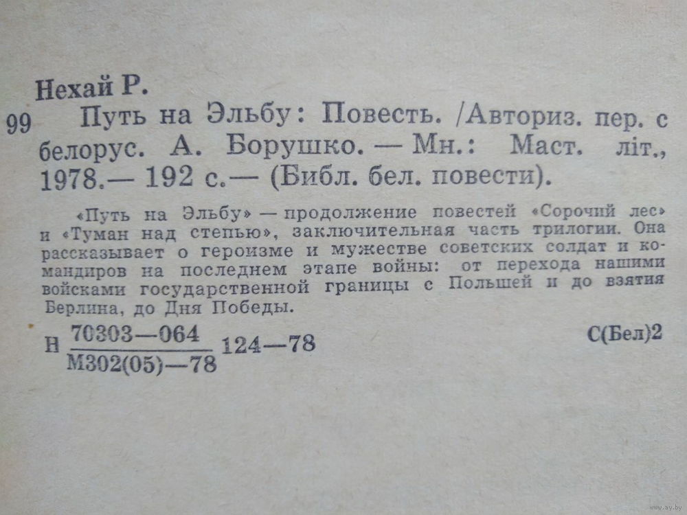 Автор на обложке Рыгор Нехай. Количество страниц 192. Издательство Мастацкая литература. Тип книги Букинистика. Тип обложки Твердый переплет. «Путь на Эльбу» — продолжение повестей «Сорочий лес» и «Туман над степью», заключительная часть трилогии. Она рассказывает о героизме и мужестве советских солдат и командиров на последнем этапе войны: от перехода нашими войсками государственной границы с Польшей и до взятия Берлина, до Дня Победы.